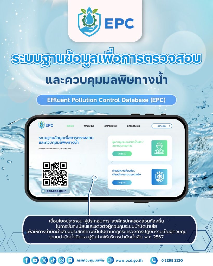 กรมควบคุมมลพิษ เปิดให้บริการระบบฐานข้อมูลเพื่อการตรวจสอบและควบคุมมลพิษทางน้ำ ข่าวสารกิจกรรม กรมควบคุมมลพิษ เปิดให้บริการระบบฐานข้อมูลเพื่อการตรวจสอบและควบคุมมลพิษทางน้ำ กรมควบคุมมลพิษ เปิดให้บริการระบบฐานข้อมูลเพื่อการตรวจสอบและควบคุมมลพิษทางน้ำ Effluent Pollution Control Database (EPC) เชื่อมโยงประชาชน ผู้ประกอบการ องค์การปกครองส่วนท้องถิ่น ในการขึ้นทะเบียนและแต่งตั้งผู้ควบคุมระบบน้ำเสีย เพื่อให้การบำบัดน้ำเสียมีประสิทธิภาพ ตามกฏกระทรวงการปฏิบัติงานเป็นผู้ควบคุม ระบบบำบัดน้ำเสียและผู้รับจ้างให้บริการบำบัดน้ำเสีย พ.ศ. 2567 ติดตามข้อมูลเพิ่มเติมได้ที่ เว็บไซต์ https://epc.pcd.go.th ที่มา : Facebook กรมควบคุมมลพิษ Post Views: 25 FacebookFacebookXTwitterLINELine