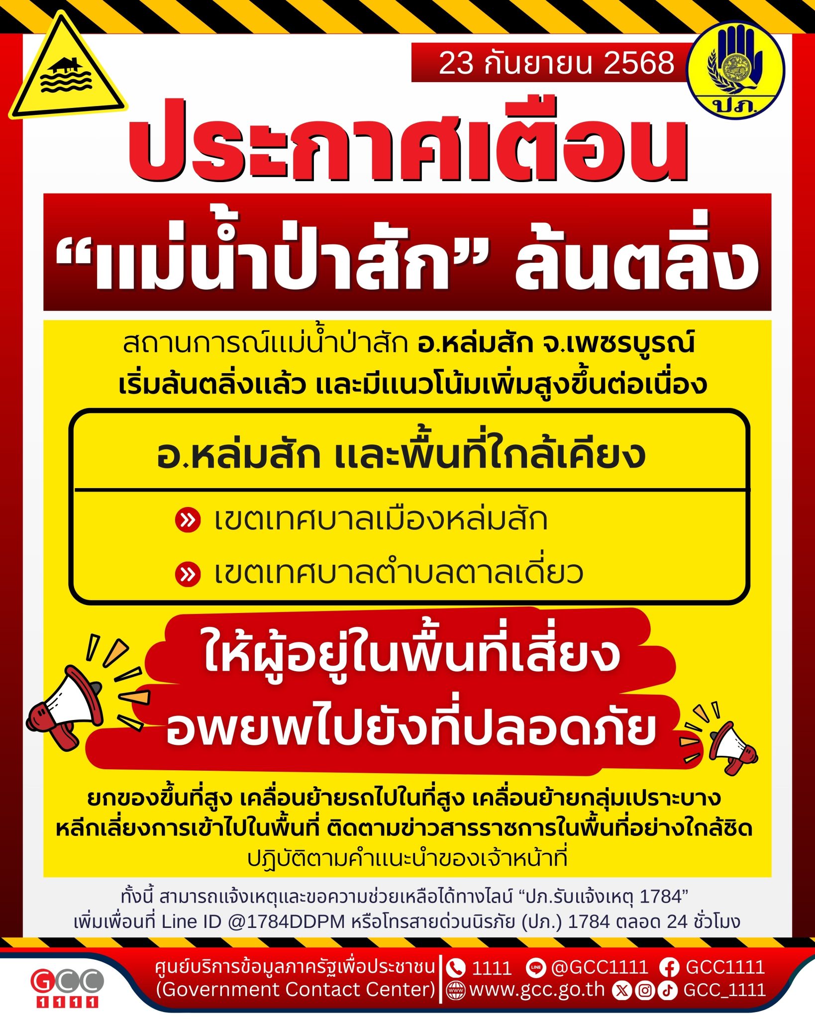 กรมป้องกันและบรรเทาสาธารณภัย แจ้งเตือนแม่น้ำป่าสักล้นตลิ่ง อ.หล่มสัก จ.เพชรบูรณ์ พื้นที่ริมแม่น้ำป่าสักให้อพยพไปที่ปลอดภัย ยกของขึ้นที่สูง