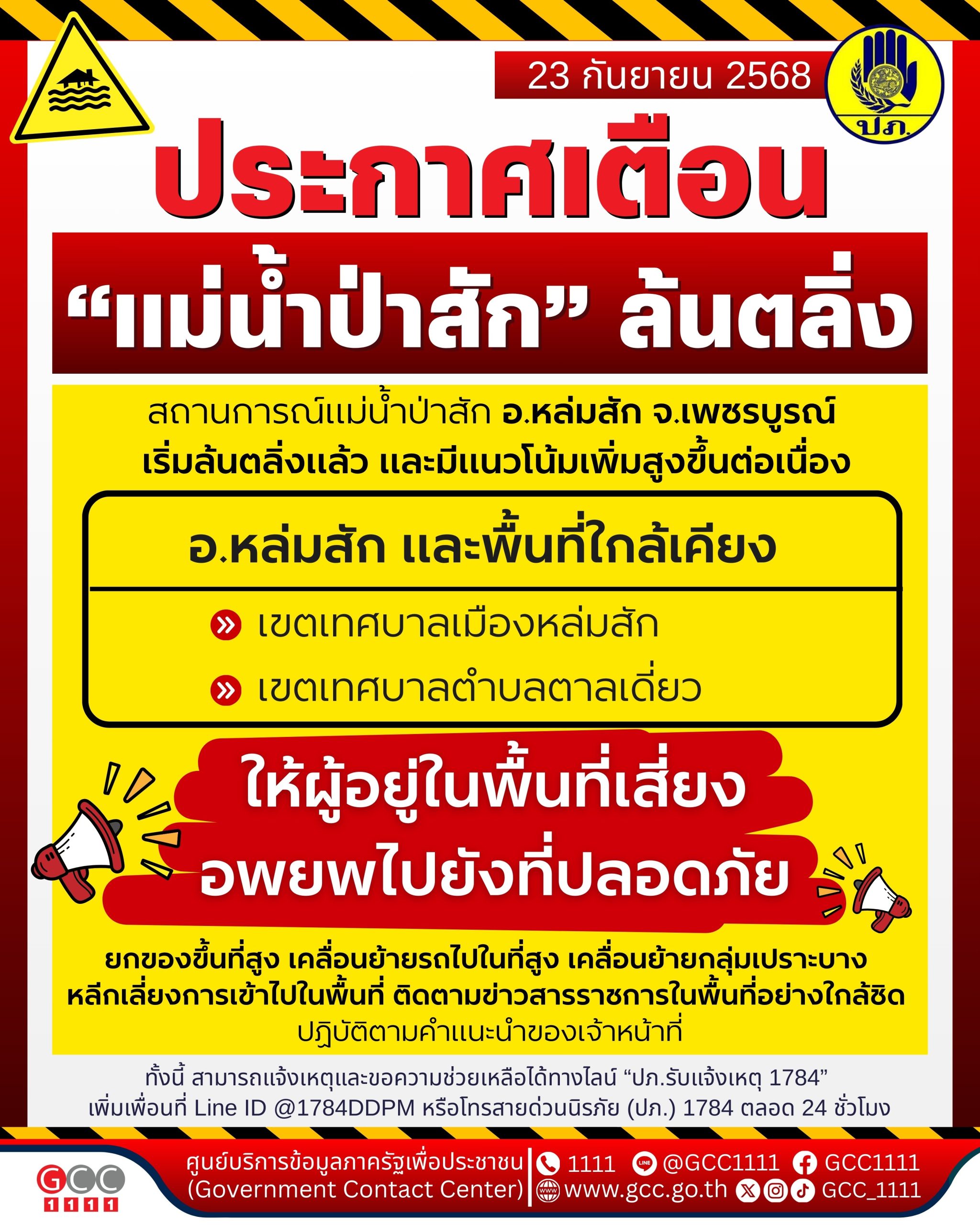 กรมป้องกันและบรรเทาสาธารณภัย แจ้งเตือนแม่น้ำป่าสักล้นตลิ่ง อ.หล่มสัก จ.เพชรบูรณ์ พื้นที่ริมแม่น้ำป่าสักให้อพยพไปที่ปลอดภัย ยกของขึ้นที่สูง