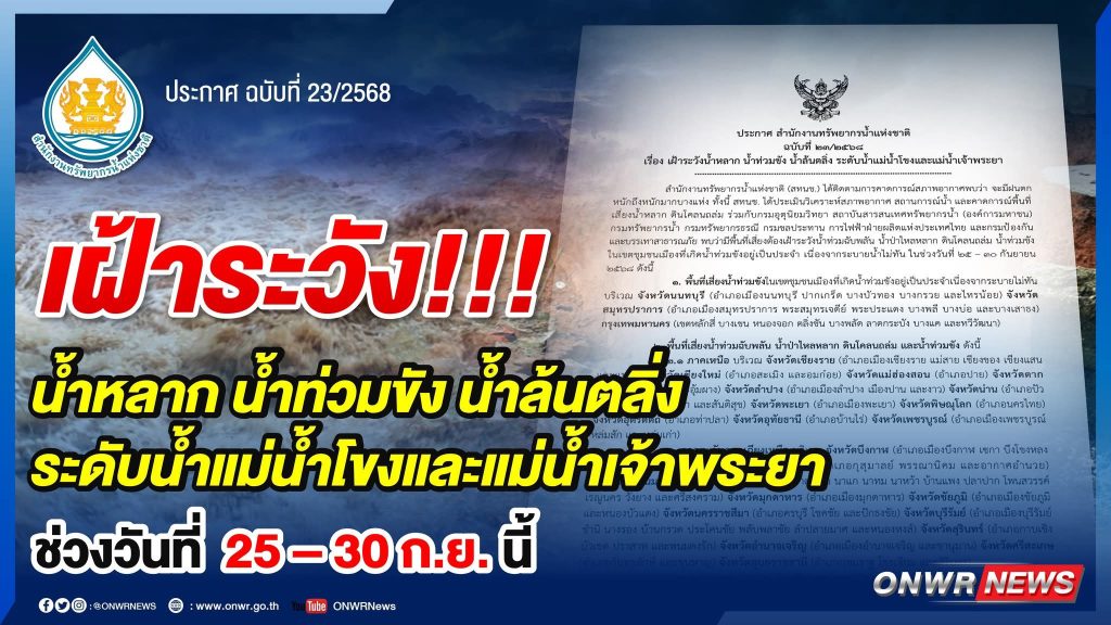 สทนช. แจ้งเตือนเฝ้าระวังน้ำหลาก น้ำท่วมขัง น้ำล้นตลิ่ง ระดับน้ำแม่น้ำโขงและแม่น้ำเจ้าพระยา ในช่วงวันที่ 25 – 30 กันยายน 2568