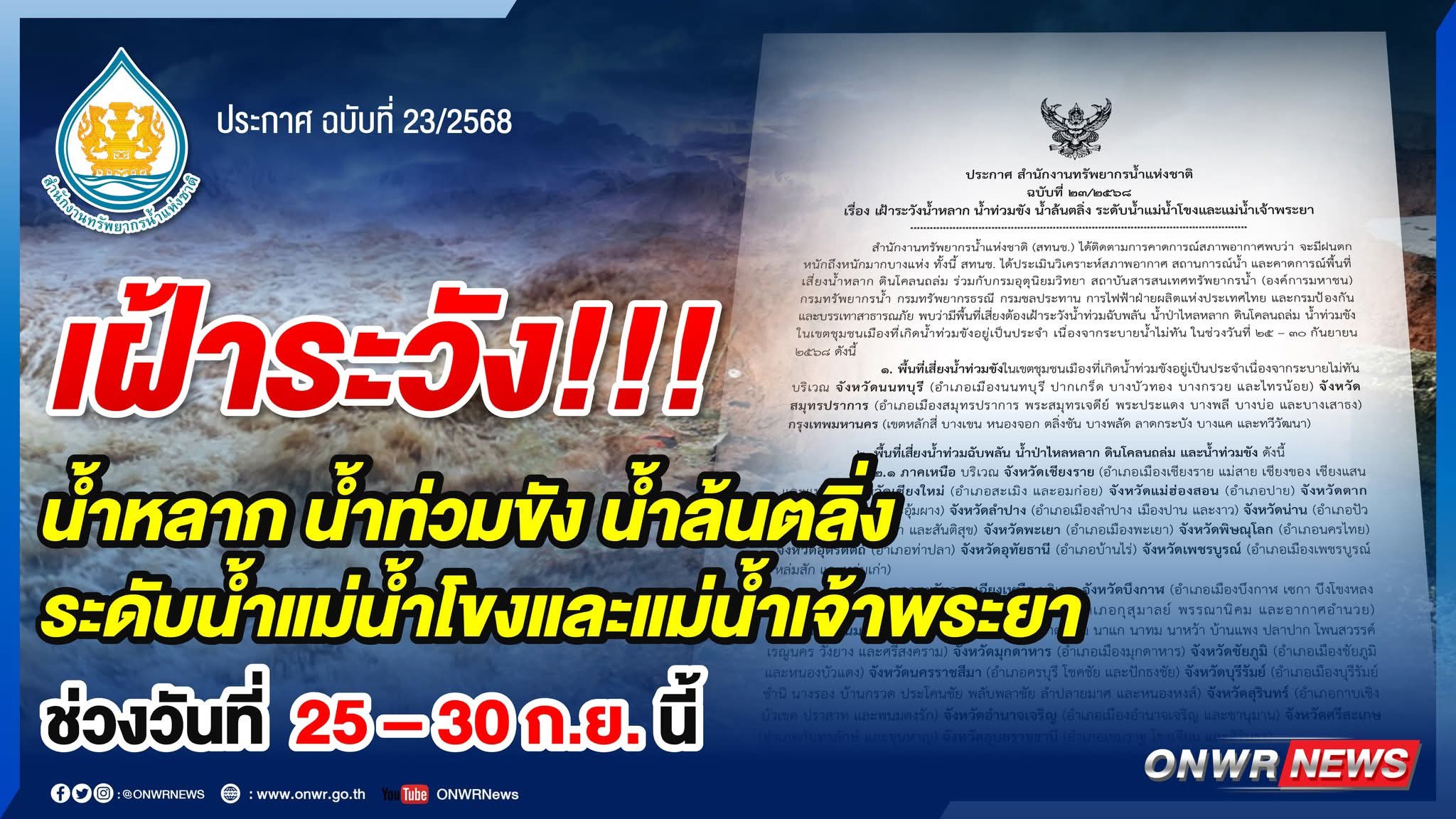 สทนช. เตือนเฝ้าระวังน้ำหลาก น้ำท่วมขัง น้ำล้นตลิ่ง ระดับแม่น้ำโขงและแม่น้ำเจ้าพระยา ช่วง 25 – 30 ก.ย. 68