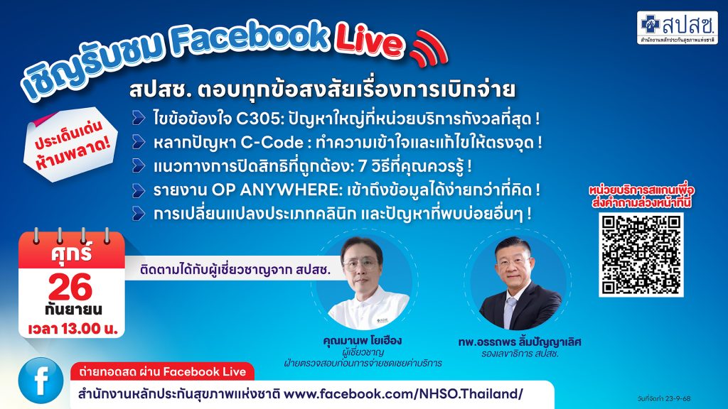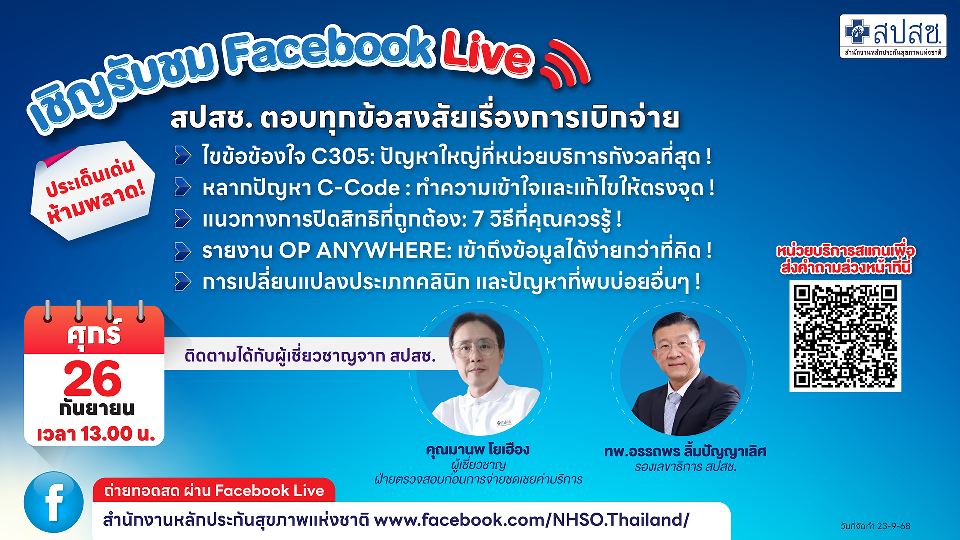 สปสช. จัดรายการ Facebook Live สปสช. ตอบทุกข้อสงสัยเรื่องการเบิกจ่าย ในวันที่ 26 กันยายน 2568 เวลา 13.00 น. รับชมผ่าน Facebook สำนักงานหลักประกันสุขภาพแห่งชาติ https://www.facebook.com/NHSO.Thailand