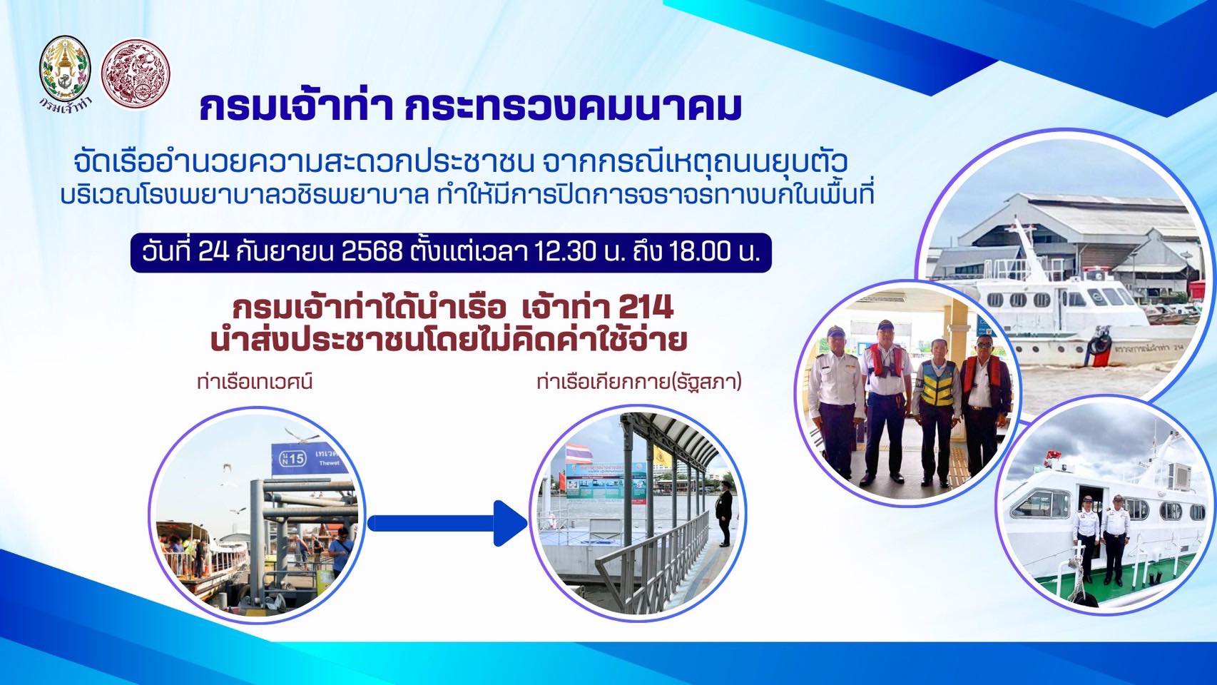 • 24 กันยายน 2568 กรมเจ้าท่า และ กองทัพเรือ จัดเรืออำนวยความสะดวกประชาชน จากกรณีเหตุถนนยุบตัว บริเวณโรงพยาบาลวชิรพยาบาล ทำให้มีการปิดการจราจรทางบกในพื้นที่
