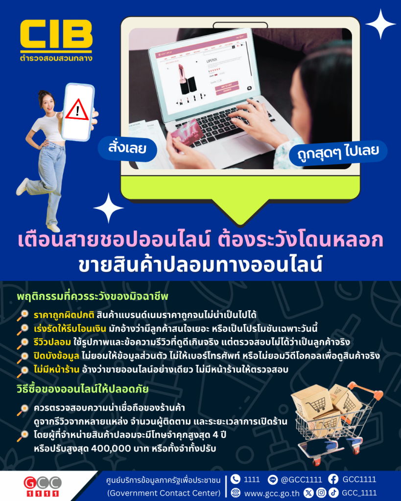 ตำรวจสอบสวนกลาง แจ้งเตือนสายชอปออนไลน์ ต้องระวังโดนหลอกขายสินค้าปลอมทางออนไลน์