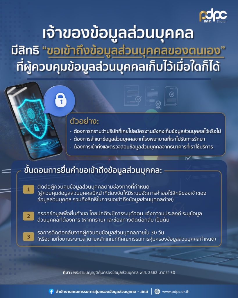 เจ้าของข้อมูลส่วนบุคคล มีสิทธิ ขอเข้าถึงข้อมูลส่วนบุคคลของตนเอง ที่ผู้ควบคุมข้อมูลส่วนบุคคลเก็บไว้เมื่อใดก็ได้