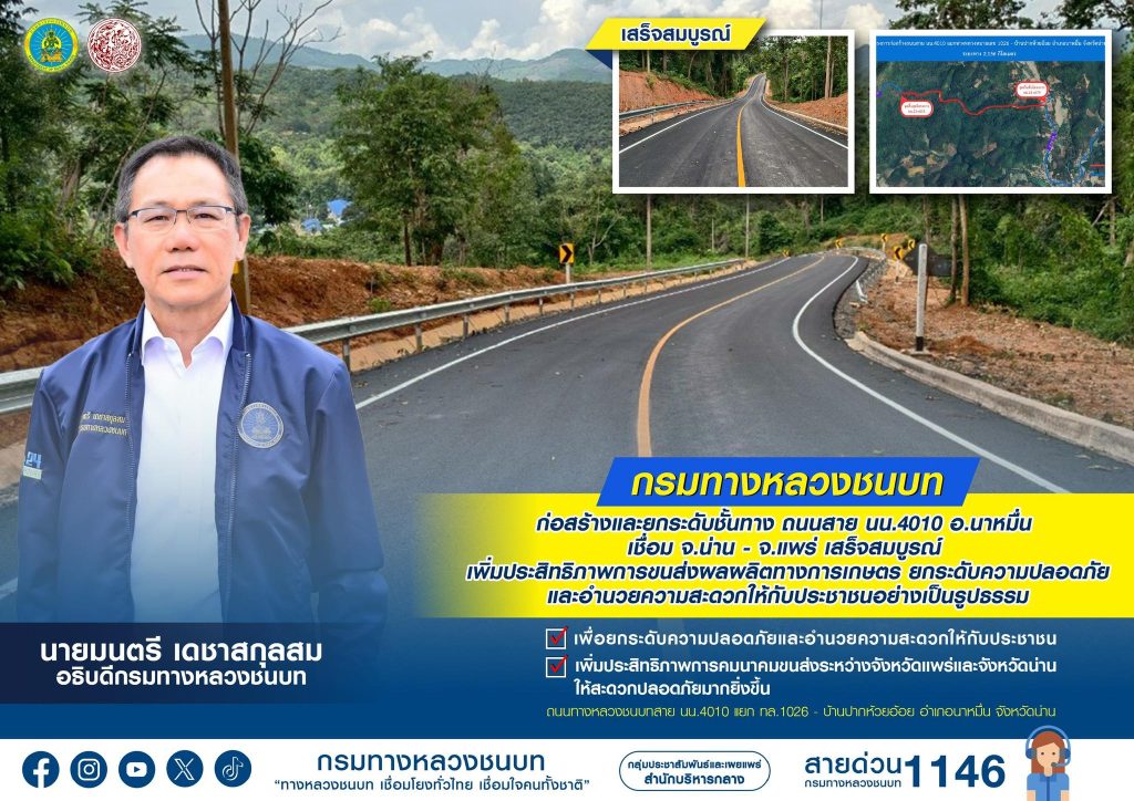 กรมทางหลวงชนบท ก่อสร้างและยกระดับชั้นทาง ถนนสาย นน.4010 อ.นาหมื่น เชื่อม จ.น่าน – จ.แพร่ เสร็จสมบูรณ์ เพิ่มประสิทธิภาพการขนส่งผลผลิตทางการเกษตร ยกระดับความปลอดภัย และอำนวยความสะดวกให้กับประชาชนอย่างเป็นรูปธรรม