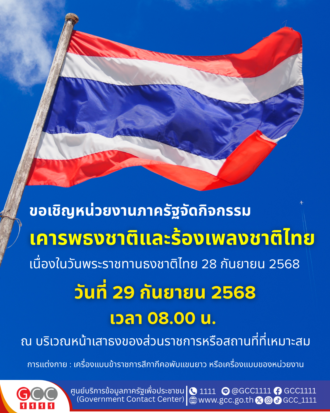 ขอเชิญหน่วยงานภาครัฐจัดกิจกรรมเคารพธงชาติและร้องเพลงชาติไทย วันที่ 29 กันยายน 2568 ข่าวสารกิจกรรม ขอเชิญหน่วยงานภาครัฐจัดกิจกรรมเคารพธงชาติและร้องเพลงชาติไทย วันที่ 29 กันยายน 2568 เนื่องในวันพระราชทานธงชาติไทย 28 กันยายน 2568 ขอเชิญหน่วยงานภาครัฐจัดกิจกรรมเคารพธงชาติและร้องเพลงชาติไทย ในวันจันทร์ที่ 29 กันยายน 2568 เวลา 08.00 น. ณ บริเวณหน้าเสาธงของส่วนราชการหรือสถานที่ที่เหมาะสม เนื่องในวันพระราชทานธงชาติไทย 28 กันยายน 2568 ขอเชิญหน่วยงานภาครัฐจัดกิจกรรมเคารพธงชาติและร้องเพลงชาติไทย ในวันจันทร์ที่ 29 กันยายน 2568 เวลา 08.00 น. ณ บริเวณหน้าเสาธงของส่วนราชการหรือสถานที่ที่เหมาะสม การแต่งกาย : เครื่องแบบข้าราชการสีกากีคอพับแขนยาว หรือเครื่องแบบของหน่วยงาน ที่มา : Facebook กรมประชาสัมพันธ์ Post Views: 340 FacebookFacebookXTwitterLINELine