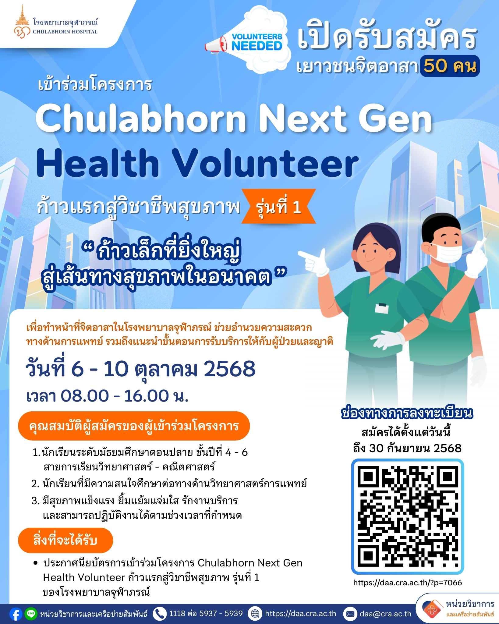- โรงพยาบาลจุฬาภรณ์ เปิดรับสมัครเยาวชนจิตอาสาร่วมโครงการ Chulabhorn Next Gen Health Volunteer ก้าวแรกสู่วิชาชีพสุขภาพ รุ่นที่ 1