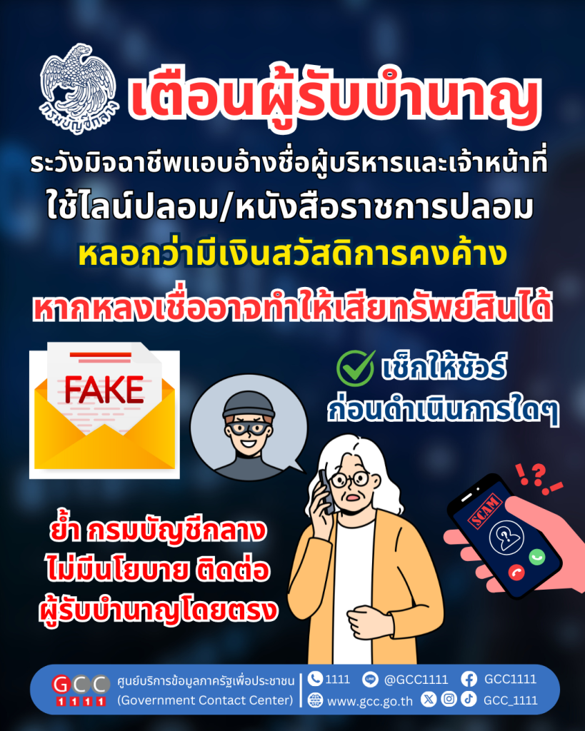 นางสาวทิวาพร ผาสุข รองอธิบดีกรมบัญชีกลางในฐานะโฆษกกรมบัญชีกลาง เปิดเผยว่า ปัจจุบันยังคงมีมิจฉาชีพแอบอ้างชื่อกรมบัญชีกลาง ชื่อผู้บริหารระดับสูงของกรมบัญชีกลางหรือเจ้าหน้าที่ของกรมบัญชีกลาง ด้วยการสร้างไลน์ปลอม หนังสือราชการปลอม อย่างต่อเนื่อง โดยล่าสุดมิจฉาชีพโทรหาผู้รับบำนาญและสร้างไลน์ปลอมที่แอบอ้างใช้ชื่อและภาพถ่ายของผู้บริหารระดับสูงของกรมบัญชีกลาง หลอกว่าผู้รับบำนาญยังมีเงินสวัสดิการที่ยังไม่ได้รับ และเร่งให้ติดต่อกรมบัญชีกลาง โดยมิจฉาชีพจะหลอกให้หลงเชื่อว่าเป็นเจ้าหน้าที่ของกรมบัญชีกลางที่เข้ามาอำนวยความสะดวก โดยให้ติดต่อรับ – ส่ง ข้อมูลผ่านทางไลน์ ซึ่งมิจฉาชีพใช้ไลน์ปลอม หากผู้รับบำนาญหลงเชื่อ นอกจากจะเสียเวลาเดินทางมาที่กรมบัญชีกลางแล้ว หากท่านส่งเอกสารส่วนตัวไปให้มิจฉาชีพทางไลน์ปลอมตามที่ได้รับแจ้ง ท่านอาจสูญเสียทรัพย์สินได้ ดังนั้น จึงขอเตือนผู้รับบำนาญ อย่าหลงเชื่อใครหรือเอกสารใดๆ ที่อ้างว่ามาจากกรมบัญชีกลาง และขอให้สงสัยว่าเป็นมิจฉาชีพไว้ก่อน ทั้งนี้ ขอให้ท่านตรวจสอบให้แน่ใจก่อนที่จะดำเนินการใดๆ ทุกครั้ง เพื่อไม่ให้ตกเป็นเหยื่อของมิจฉาชีพ