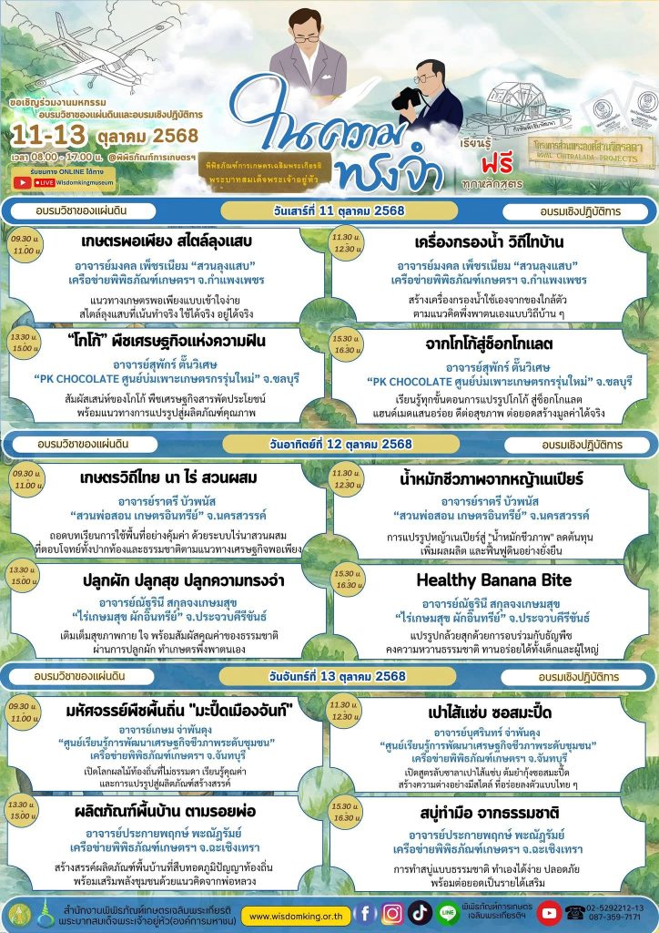 ขอเชิญทุกท่านร่วมน้อมรำลึกในพระมหากรุณาธิคุณ และซาบซึ้งในพระอัจฉริยภาพอันยิ่งใหญ่ของ ในหลวงรัชกาลที่ 9 ผ่านนิทรรศการและกิจกรรมมากมายในงานมหกรรมในความทรงจำ ระหว่างวันที่ 11 – 13 ตุลาคม 2568 ตั้งแต่เวลา 08.00 – 17.00 น. ณ พิพิธภัณฑ์การเกษตรฯ จ.ปทุมธานี