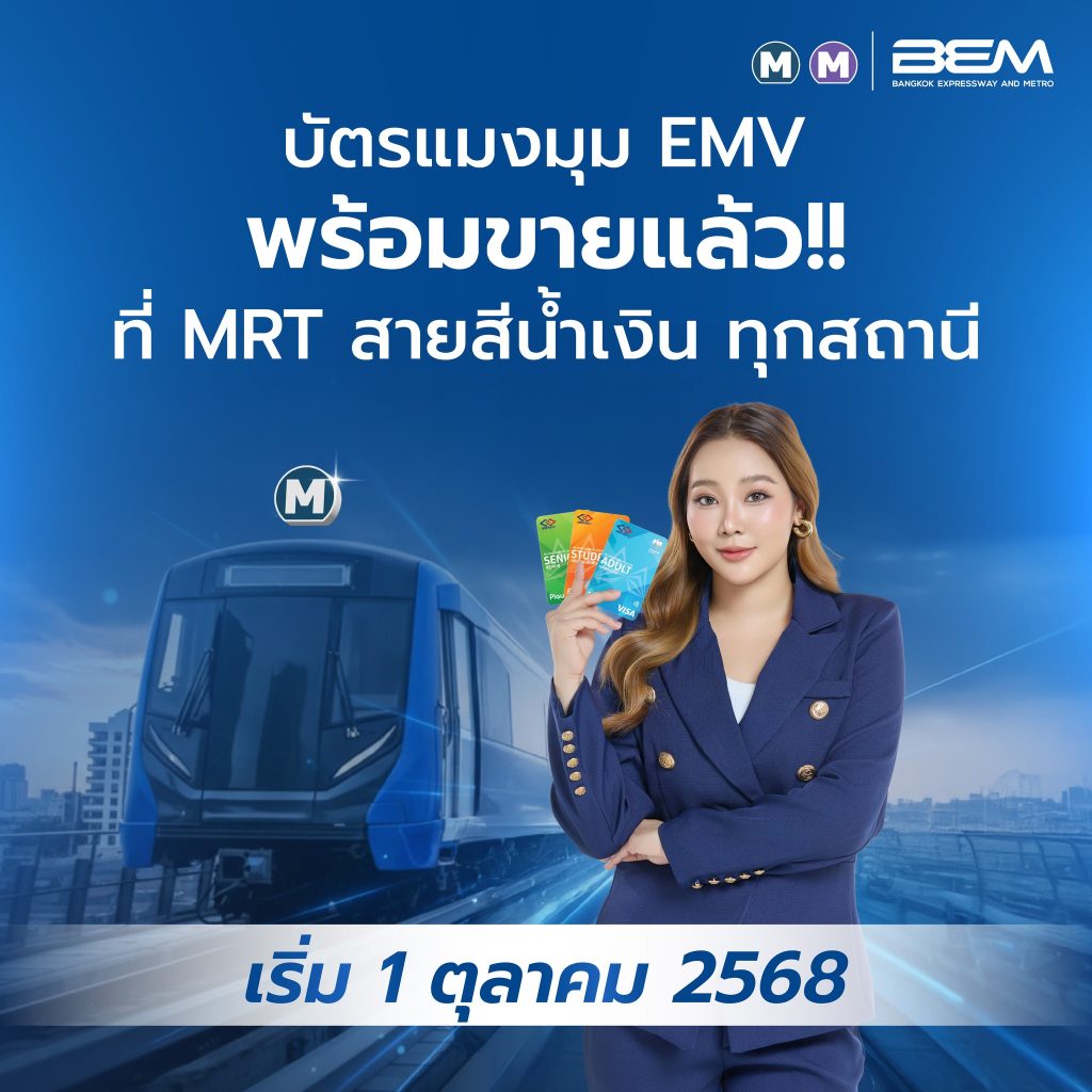 BEM เปิดจำหน่ายบัตร Mangmoom EMV ทุกสถานี MRT สายสีน้ำเงิน เริ่ม 1 ตุลาคม 2568 ข่าวสารกิจกรรม BEM เปิดจำหน่ายบัตร Mangmoom EMV ทุกสถานี MRT สายสีน้ำเงิน เริ่ม 1 ตุลาคม 2568 BEM เปิดจำหน่ายบัตร Mangmoom EMV ทุกสถานี MRT สายสีน้ำเงิน เริ่มวันที่ 1 ตุลาคม 2568 โดยหลังจากซื้อบัตรโดยสาร MangmoomEMV แล้วก่อนใช้งานครั้งแรก ผู้โดยสารจำเป็นต้องทำการเปิดใช้งานบัตร ผ่านทางแอปพลิเคชัน “เป๋าตัง” ผ่านสมาร์ทโฟนของผู้โดยสาร บริษัท ทางด่วนและรถไฟฟ้ากรุงเทพ จำกัด (มหาชน) เปิดจำหน่ายบัตร Mangmoom EMV ทุกสถานี MRT สายสีน้ำเงิน เริ่มวันที่ 1 ตุลาคม 2568โดยจะแบ่งออกเป็น 3 ประเภทของบัตร ดังนี้Adult สำหรับบุคลทั่วไปStudent สำหรับนักเรียน/นิสิต/นักศึกษา ตั้งแต่อายุ 15 – 23 ปีSenior สำหรับผู้สูงอายุ ที่มีอายุเกิน 60 ปีขึ้นไป โดยหลังจากซื้อบัตรโดยสาร MangmoomEMV แล้วก่อนใช้งานครั้งแรก ผู้โดยสารจำเป็นต้องทำการเปิดใช้งานบัตร ผ่านทางแอปพลิเคชัน “เป๋าตัง” ผ่านสมาร์ทโฟนของผู้โดยสาร อ่านรายละเอียดเพิ่มเติม คลิกที่นี่ หากมีข้อสงสัยเพิ่มเติม สามารถติดต่อสอบถามได้ทาง ธนาคารกรุงไทย 0 2111 1111 หรือสาขาของ ธนาคารกรุงไทย ทุกสาขา ที่มา : Facebook BEM Bangkok Expressway and Metro Post Views: 10 FacebookFacebookXTwitterLINELine