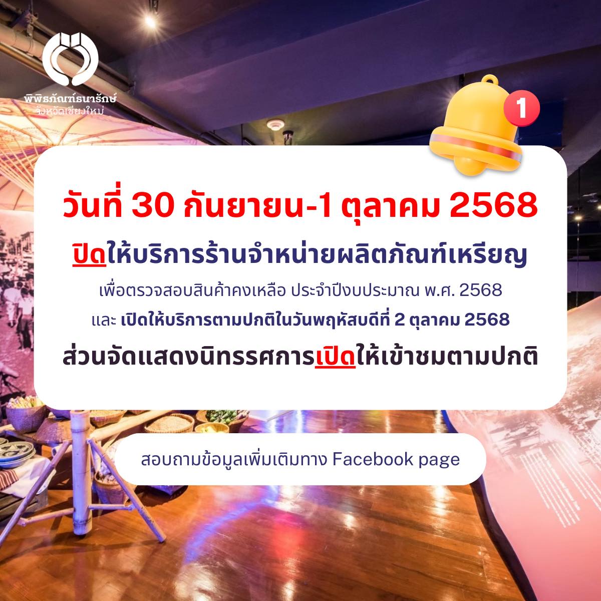 พิพิธภัณฑ์ธนารักษ์ จังหวัดเชียงใหม่ แจ้งปิดให้บริการร้านจำหน่ายผลิตภัณฑ์เหรียญ เพื่อตรวจสอบสินค้าคงเหลือ ประจำปี 2568 วันที่ 30 กันยายน – 1 ตุลาคม 2568 และเปิดให้บริการตามปกติในวันพฤหัสบดีที่ 2 ตุลาคม 2568 ส่วนจัดแสดงนิทรรศการเปิดให้เข้าชมตามปกติ สอบถามข้อมูลเพิ่มเติมโทร 0 5322 4237 หรือทาง inbox