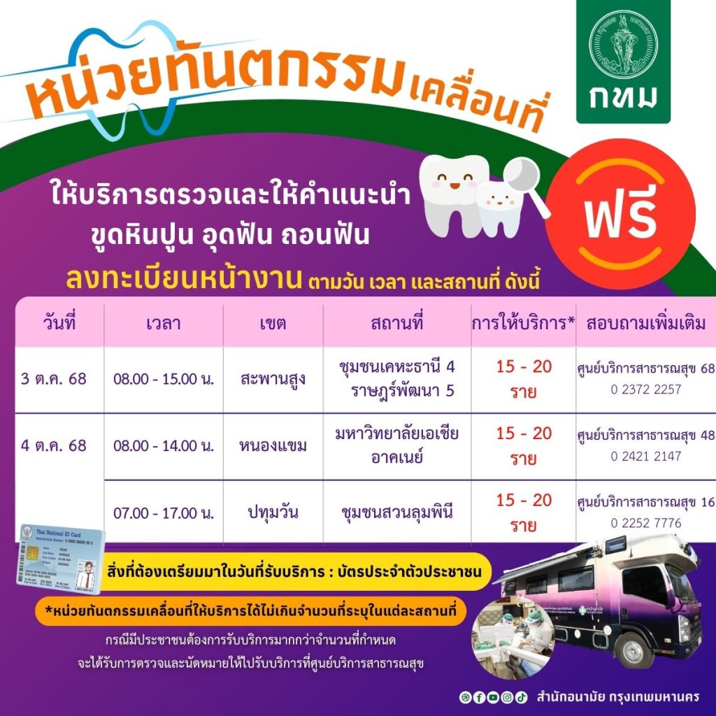 สำนักอนามัย กรุงเทพมหานคร จัดหน่วยทันตกรรมเคลื่อนที่ ฟรี วันที่ 3 – 4 ตุลาคม 2568