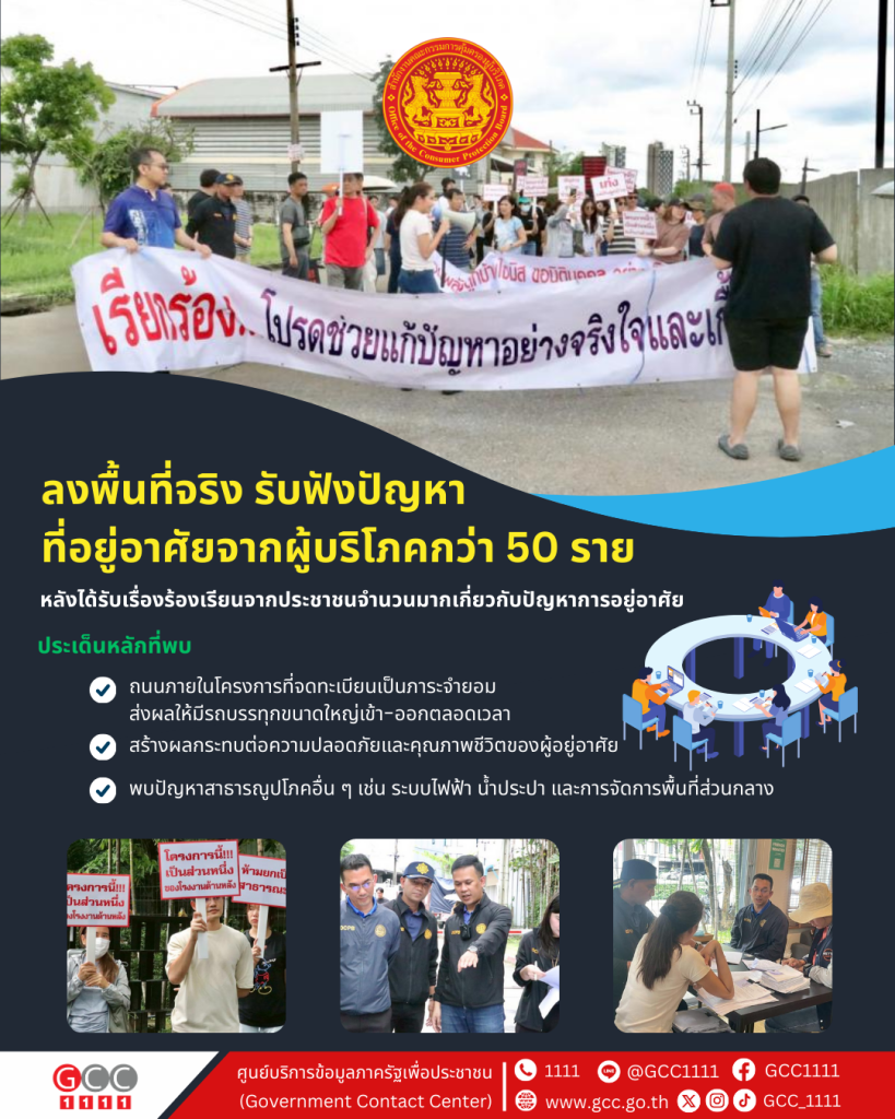 วันเสาร์ที่ 27 กันยายน 2568 เวลา 10.00 น. เลขาธิการคณะกรรมการคุ้มครองผู้บริโภค (นายรณรงค์ พูลพิพัฒน์) มอบหมายให้นายเลิศศักดิ์ รักธรรม ผู้อำนวยการกองคุ้มครองผู้บริโภค 3 ลงพื้นที่ตรวจสอบโครงการหมู่บ้านจัดสรร เขตคันนายาว รับฟังปัญหาผู้บริโภคประมาณ 50 ราย กรณีซื้อบ้านและที่ดิน ต่อมาถนนภายในโครงการจดทะเบียนเป็นภาระจำยอม ทำให้มีรถบรรทุกขนาดใหญ่เข้า-ออก ส่งผลกระทบต่อการอยู่อาศัย รวมทั้งพบปัญหาสาธารณูปโภคอื่น ๆ โดย สคบ. ได้อธิบายแนวทางการให้ความช่วยเหลือและจะรวบรวมข้อเท็จจริงเพื่อประกอบการดำเนินการช่วยเหลือผู้บริโภคให้ได้รับความเป็นธรรมต่อไป