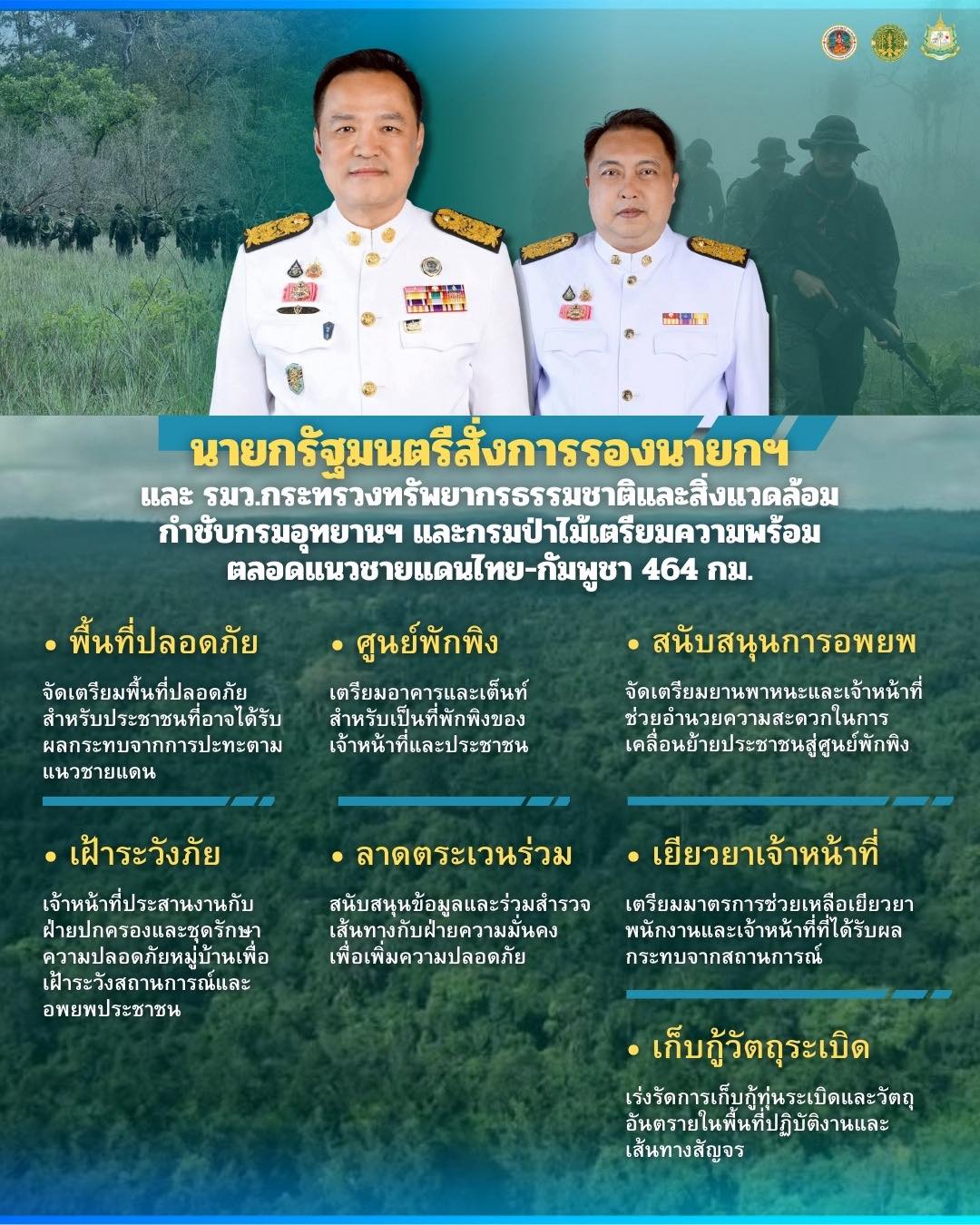 กระทรวงทรัพยากรธรรมชาติและสิ่งแวดล้อม สั่งการเร่งด่วนให้ปลัดกระทรวงฯ และกรมอุทยานแห่งชาติฯ จัดกำลังเจ้าหน้าที่ อุปกรณ์ และพาหนะ เตรียมพร้อมรองรับการอพยพและช่วยเหลือประชาชน ที่ได้รับผลกระทบจากเหตุปะทะบริเวณชายแดนไทย – กัมพูชา