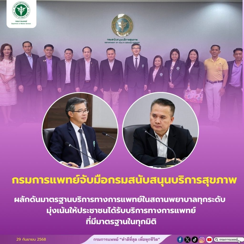 กรมการแพทย์จับมือกรมสนับสนุนบริการสุขภาพ (สบส.) ผลักดันมาตรฐานทางการแพทย์ในสถานพยาบาลมุ่งเน้นการทำงานร่วมกัน เพื่อแก้ไขปัญหาและกำหนดมาตรฐานทางการแพทย์ในสถานพยาบาล เพื่อยกระดับและเพิ่มการเข้าถึงบริการทางการแพทย์ ส่งเสริมเทคโนโลยีและนวัตกรรม บูรณาการระบบสุขภาพ สนับสนุนนโยบายสาธารณสุข พัฒนาบุคลกรและทรัพยากร โดยมุ่งเน้นให้ประชาชนได้รับบริการทางการแพทย์ที่ดี มีคุณภาพได้มาตรฐานในทุกๆ มิติ