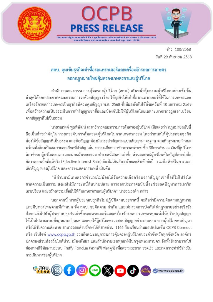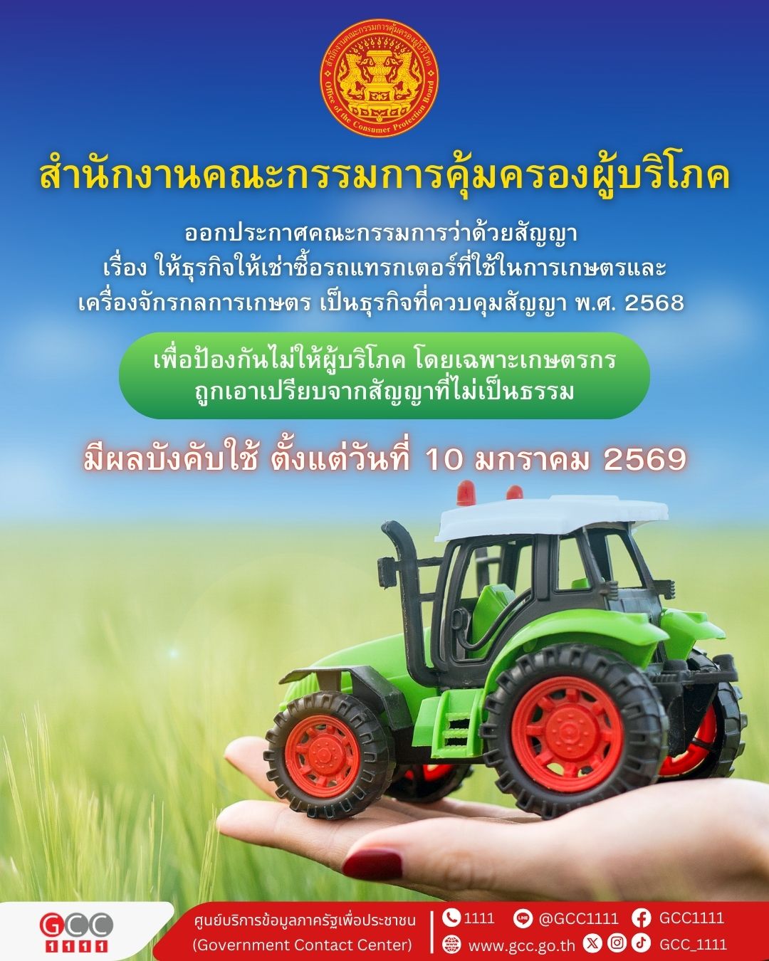 สํานักงานคณะกรรมการคุ้มครองผู้บริโภค ออกกฎหมายในการทําสัญญาเช่าซื้อและป้องกันไม่ให้ผู้บริโภค โดยเฉพาะเกษตรกรถูกเอาเปรียบ ประกาศคณะกรรมการว่าด้วยสัญญา เรื่อง ให้ธุรกิจให้เช่าซื้อรถแทรกเตอร์ที่ใช้ในการเกษตรและ เครื่องจักรกลการเกษตรเป็นธุรกิจ ที่ควบคุมสัญญา พ.ศ. 2568 มีผลบังคับใช้ตั้งแต่ วันที่ 10 มกราคม 2569
