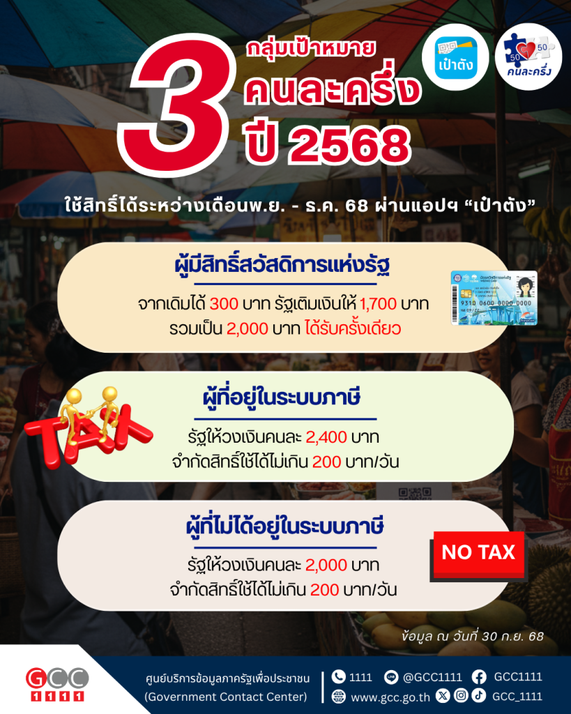 ด้านนายสิริพงศ์ อังคสกุลเกียรติ รองหัวหน้าพรรคภูมิใจไทย ระบุว่า หลังจากกลุ่มผู้ถือบัตรสวัสดิการแห่งรัฐแล้ว จะเป็นกลุ่มที่ไม่ได้อยู่ในระบบภาษี จำนวน 9 ล้านคน คนละ 2,000 บาท จ่ายได้วันละไม่เกิน 200 บาท และผู้ที่อยู่ในระบบภาษี จำนวน 11 ล้านคน คนละ 2,400 บาท จ่ายได้วันละไม่เกิน 200 บาท จะเริ่มให้ลงทะเบียนในเดือนตุลาคม 2568และใช้จ่ายได้ในเดือนพฤศจิกายน – ธันวาคม 2568 ซึ่งผู้มีสิทธิ์ต้องมีอายุ 16 ปีขึ้นไป และใช้จ่ายผ่านแอปพลิเคชัน “เป๋าตัง”