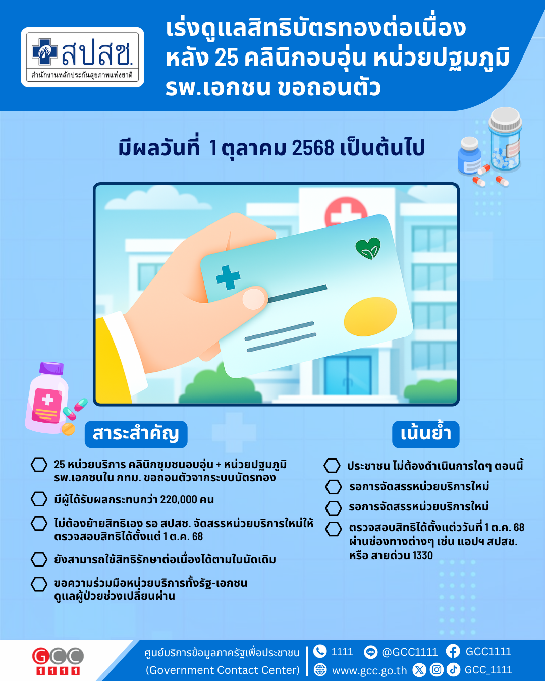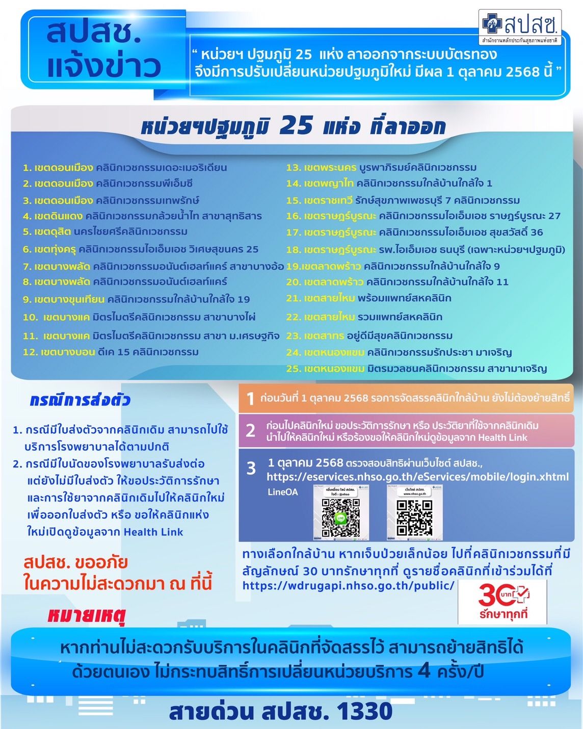 สำนักงานหลักประกันสุขภาพแห่งชาติ แจ้งหน่วยปฐมภูมิ 25 แห่ง ลาออกจากระบบบัตรทอง มีผลวันที่ 1 ตุลาคม 2568 สามารถตรวจสอบสิทธิการรักษาก่อนใช้บริการ คลิกที่นี่
