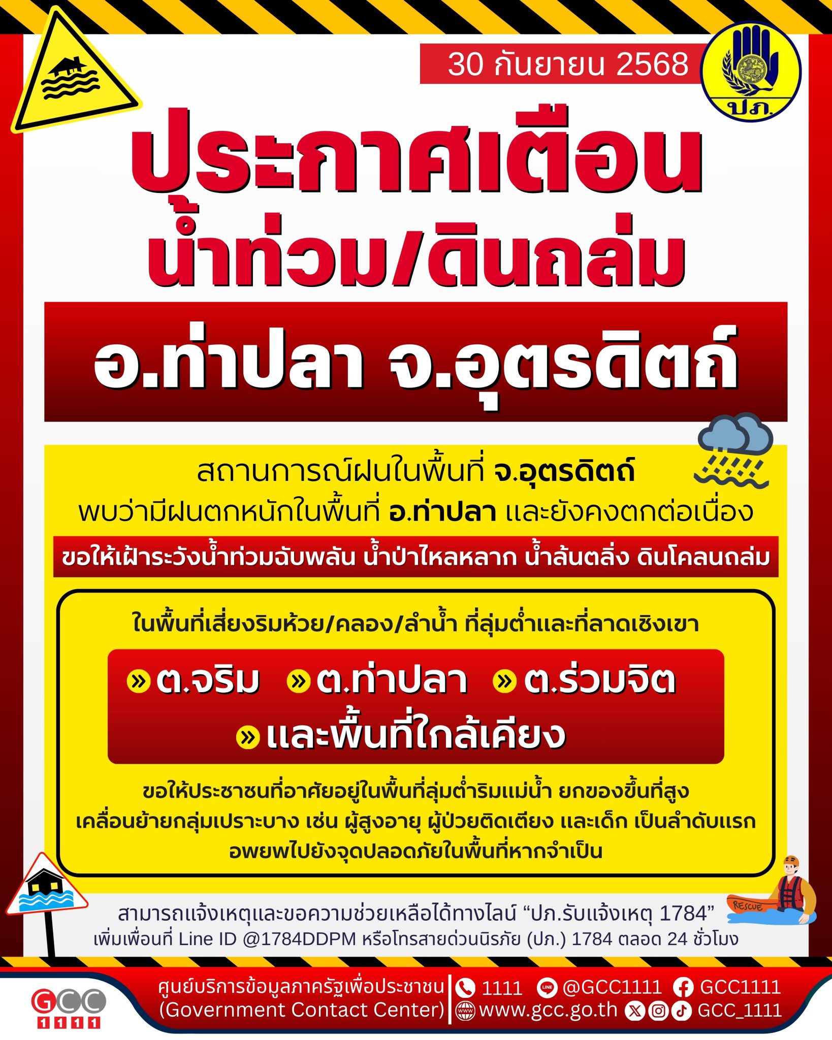 กรมป้องกันและบรรเทาสาธารณภัย แจ้งเตือนน้ำท่วม ดินถล่ม อ.ท่าปลา จ.อุตรดิตถ์