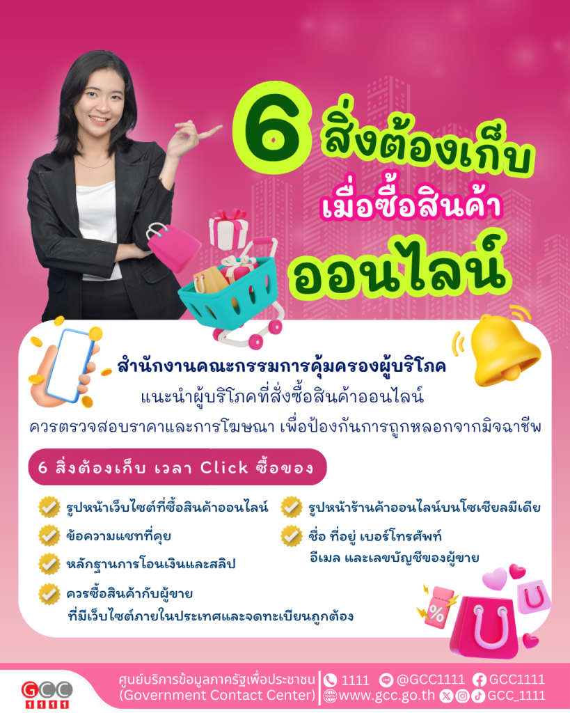 สำนักงานคณะกรรมการคุ้มครองผู้บริโภค แนะนำ 6 สิ่งต้องเก็บ เมื่อสั่งซื้อสินค้าออนไลน์ ข่าวสารกิจกรรม สำนักงานคณะกรรมการคุ้มครองผู้บริโภค แนะนำ 6 สิ่งต้องเก็บ เมื่อสั่งซื้อสินค้าออนไลน์ สำนักงานคณะกรรมการคุ้มครองผู้บริโภค แนะนำ 6 สิ่งต้องเก็บ เมื่อสั่งซื้อสินค้าออนไลน์ ผู้บริโภคที่สั่งซื้อสินค้าออนไลน์ควรตรวจสอบราคาและการโฆษณาเพื่อป้องกันการถูกหลอกจากมิจฉาชีพ1. รูปหน้าเว็บไซต์ที่ซื้อสินค้าออนไลน์2. รูปหน้าร้านค้าออนไลน์บนโซเชียลมีเดีย3. ข้อความแชทที่คุยรายละเอียดการสั่งซื้อสินค้า4. ชื่อ ที่อยู่ เบอร์โทรศัพท์ อีเมล และเลขบัญชีของผู้ขาย5. หลักฐานการโอนเงิน และสลิปโอนเงินค่าสินค้า6. ควรซื้อสินค้ากับผู้ขายที่มีเว็บไซต์ภายในประเทศและจดทะเบียนถูกต้อง ที่มา : Facebook สำนักงานคณะกรรมการคุ้มครองผู้บริโภค Post Views: 18 FacebookFacebookXTwitterLINELine