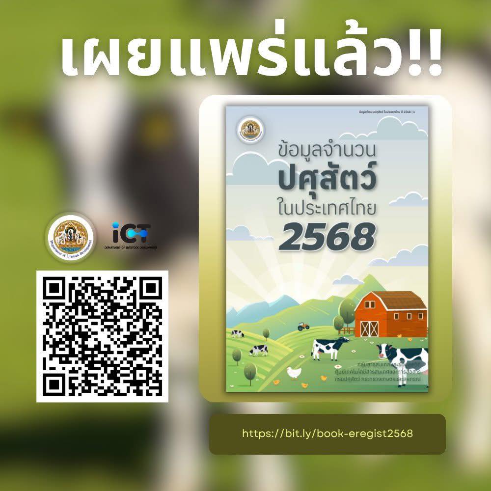 หนังสือข้อมูลจำนวนปศุสัตว์ในประเทศไทย ประจำปี 2568 https://bit.ly/book-eregist2568 โดย ศูนย์เทคโนโลยีสารสนเทศและการสื่อสาร กรมปศุสัตว์