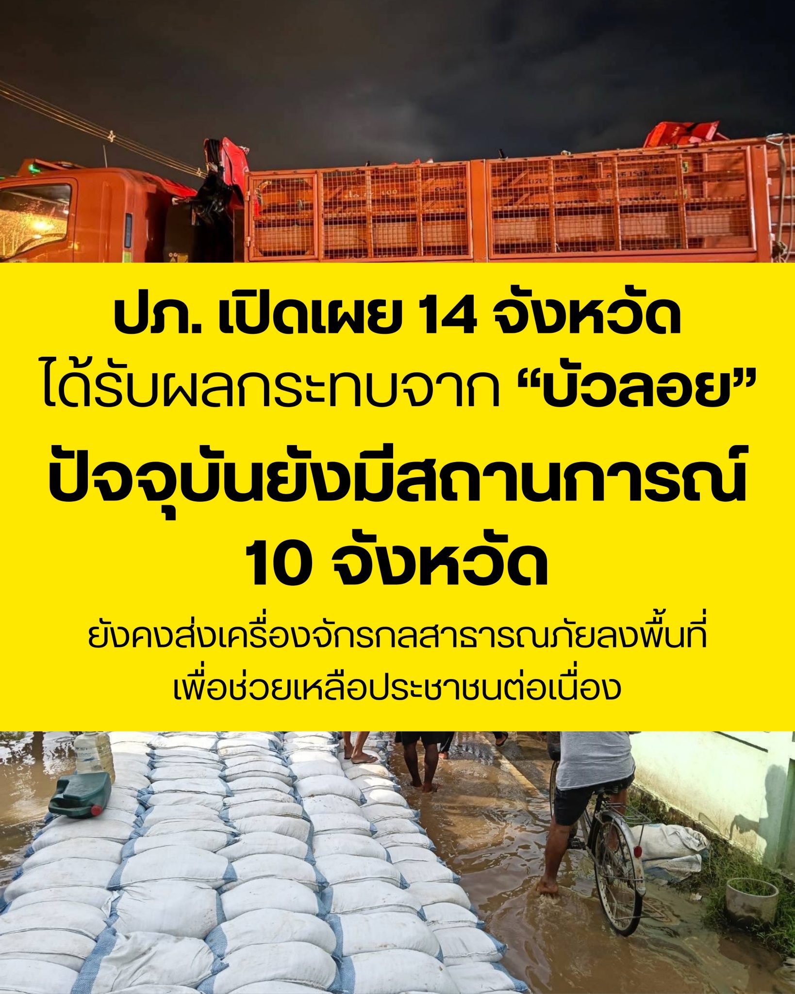 กรมป้องกันและบรรเทาสาธารภัย เปิดเผย 14 จังหวัดได้รับผลกระทบจาก “บัวลอย” ปัจจุบันยังมีสถานการณ์ 10 จังหวัด