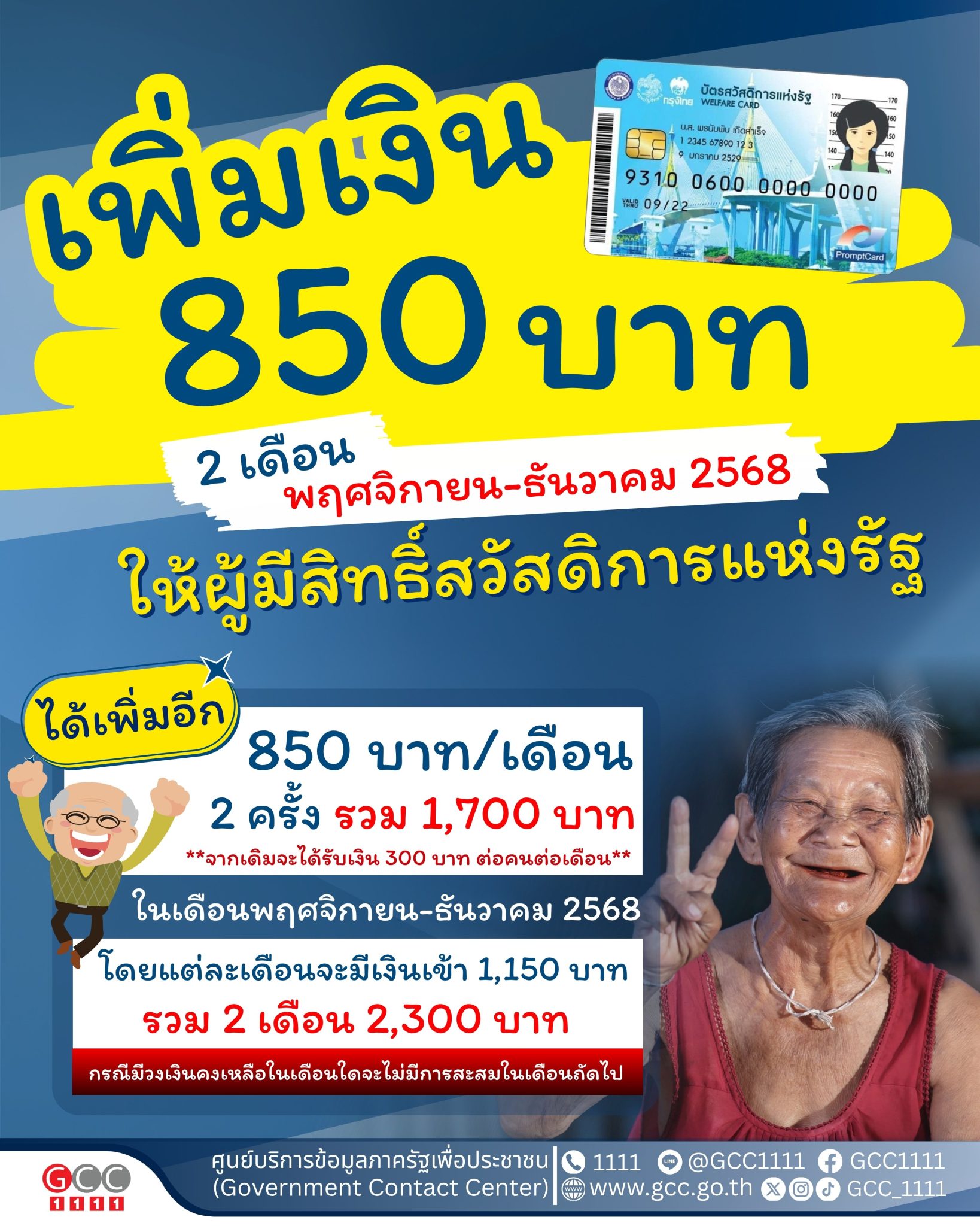 ครม. มีมติเห็นชอบโครงการเพิ่มวงเงินสวัสดิการให้แก่ผู้มีบัตรสวัสดิการแห่งรัฐ ปี 2568 โดยหลักเกณฑ์จะเพิ่มเงินจากที่ได้รับจำนวน 300 บาทต่อคนต่อเดือน อีก 850 บาท
