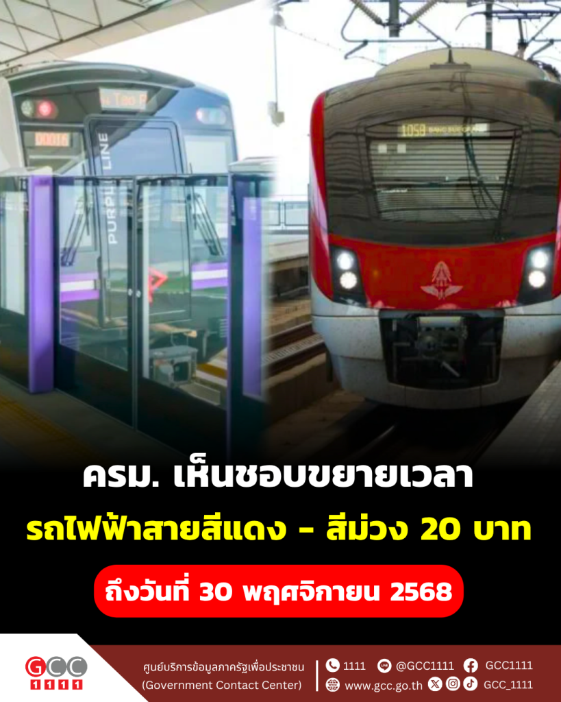 คณะรัฐมนตรี มีมติเห็นชอบให้คงมาตรการค่าโดยสารรถไฟฟ้าสูงสุด 20 บาทตลอดสาย สำหรับรถไฟฟ้าสายสีแดง และสายสีม่วง จากเดิมที่จะสิ้นสุด 30 กันยายน 2568 เป็นสิ้นสุดถึงวันที่ 30 พฤศจิกายน 2568 เพื่อบรรเทาภาระค่าใช้จ่ายของประชาชน