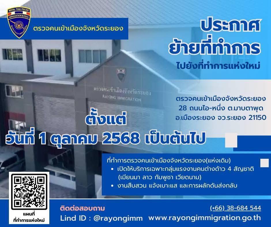 ตรวจคนเข้าเมืองจังหวัดระยอง แจ้งย้ายที่ทำการตรวจคนเข้าเมืองจังหวัดระยอง (แห่งใหม่) ตั้งแต่วันที่ 1 ตุลาคม 2568 เป็นต้นไป