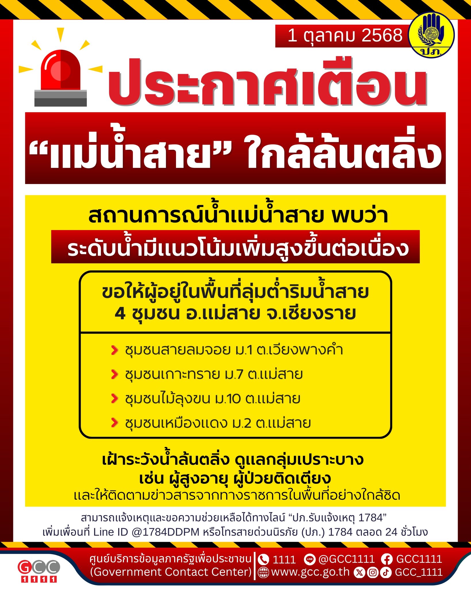 กรมป้องกันและบรรเทาสาธารณภัย แจ้งเตือนแม่น้ำสายใกล้ล้นตลิ่ง 4 ชุมชน อ.แม่สาย จ.เชียงราย ให้เฝ้าระวังน้ำล้นตลิ่ง