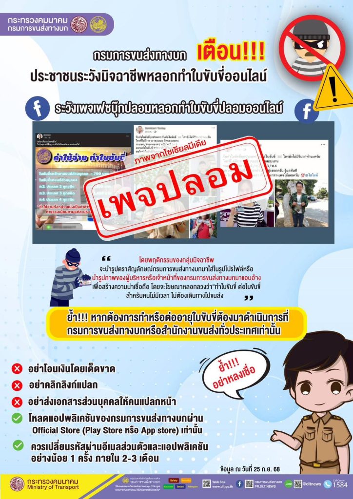 นายเสกสม อัครพันธุ์ รองอธิบดีกรมการขนส่งทางบก และโฆษกกรมการขนส่งทางบก กล่าวว่า ปัจจุบันมีมิจฉาชีพแอบอ้างในการรับทำธุรกรรมกับกรมการขนส่งทางบกผ่านทางสื่อออนไลน์ แอปพลิเคชัน รวมถึงเว็บไซต์ โดยเฉพาะอย่างยิ่ง การรับทำหรือต่ออายุใบขับขี่ ซึ่งพฤติกรรมของมิจฉาชีพจะนำรูปตราสัญลักษณ์กรมการขนส่งทางบก รูปภาพของผู้บริหารหรือเจ้าหน้าที่มาใส่ในรูปโปรไฟล์ พร้อมนำรูปภาพของผู้ที่ได้รับใบขับขี่มาแอบอ้าง เพื่อสร้างความน่าเชื่อถือ โดยโฆษณาหลอกลวงว่า “รับทำใบขับขี่ ต่อใบขับขี่ สำหรับคนไม่มีเวลา ไม่ต้องเดินทางไปขนส่ง สามารถรอรับที่บ้านได้เลย” เมื่อประชาชนสนใจติดต่อเข้าไปจะมีการโทรติดต่อหรือส่งข้อความเพื่อเชิญชวนให้ Add Line และมีการเรียกเก็บค่าธรรมเนียมแพงกว่าที่กฎหมายกำหนด ซึ่งอาจทำให้ประชาชนสับสนและถูกหลอกลวงจนก่อให้เกิดความเสียหายได้ กรมการขนส่งทางบกจึงขอเตือนประชาชนอย่าหลงเชื่อกลุ่มมิจฉาชีพที่มีพฤติกรรมในลักณะดังกล่าว หรือทำธุรกรรมกับแอปพลิเคชัน และเว็บไซต์ที่น่าสงสัยเด็ดขาด เนื่องจากอาจสูญเสียทรัพย์สินและเอกสารส่วนบุคคล อีกทั้งยังเสี่ยงได้รับใบขับขี่ปลอม ซึ่งผู้หลงเชื่อจะมีความผิดฐานปลอมแปลงหรือใช้เอกสารราชการปลอมตามประมวลกฎหมายอาญา มีโทษถึงขั้นจำคุกตั้งแต่ 6 เดือน – 5 ปี และปรับตั้งแต่ 10,000 – 100,000 บาท พร้อมเน้นย้ำการทำธุรกรรมกับกรมการขนส่งทางบกสามารถดูข้อมูลที่ถูกต้องได้ที่เว็ปไซต์ https://www.dlt.go.th/ ซึ่งภายในเว็บไซต์จะมีข้อมูลขั้นตอนการทำธุรกรรมต่าง ๆ และการตรวจสอบเอกสารอย่างถูกต้อง