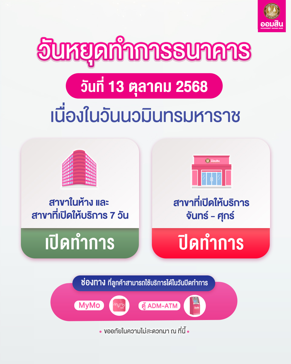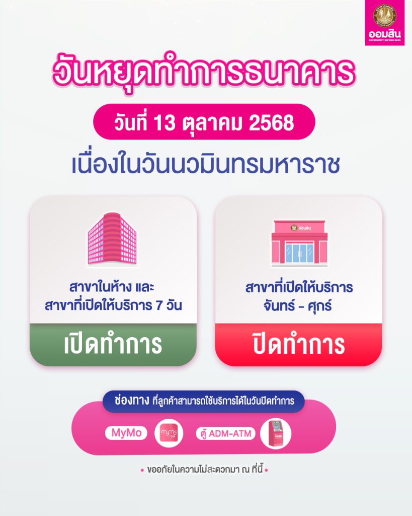 ธนาคารออมสิน แจ้งหยุดทำการ วันที่ 13 ตุลาคม 2568 เนื่องในวันนวมินทรมหาราช