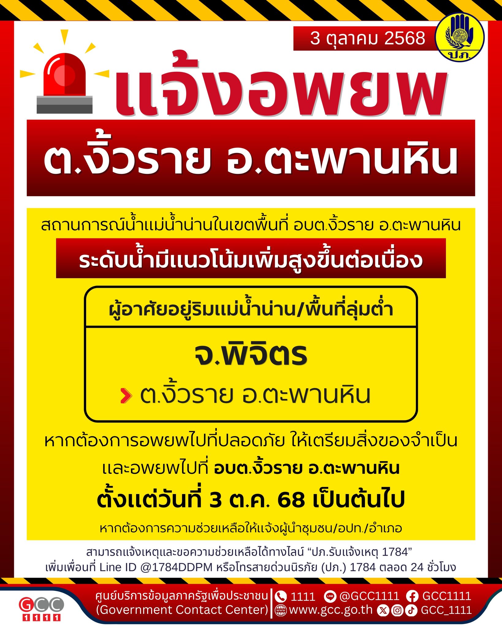 หากมีความต้องการอพยพไปอยู่ในสถานที่ปลอดภัย ขอให้จัดเตรียมสิ่งของเครื่องใช้ที่จำเป็น/ยาประจำตัว โดยขอให้อพยพไปที่ ที่ทำการ อบต.งิ้วราย อ.ตะพานหิน ได้ตั้งแต่วันที่ 3 ต.ค.68 เป็นต้นไป