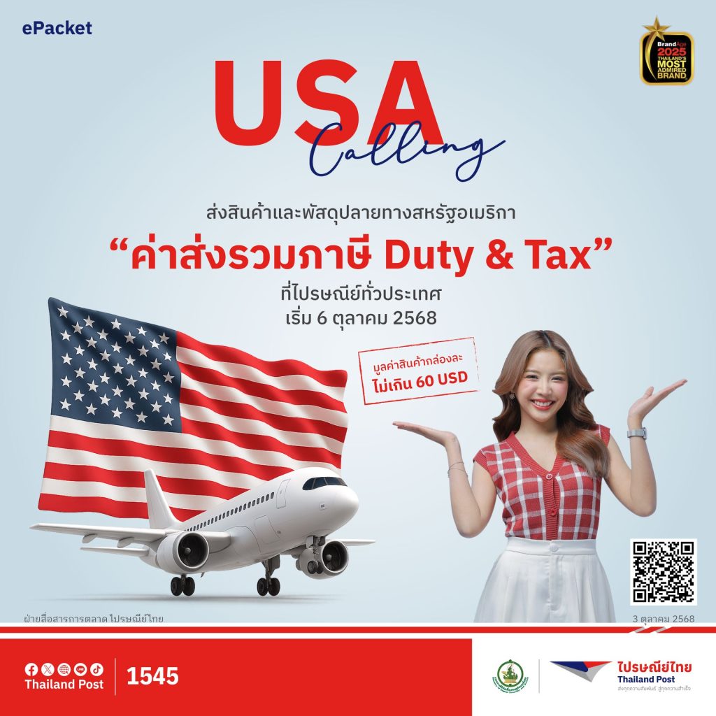 บริษัท ไปรษณีย์ไทย จำกัด เปิดให้บริการ ePacket รูปแบบใหม่ ส่งสินค้าไปสหรัฐอเมริกา แบบ DDP (Delivered Duty Paid) เริ่ม 6 ตุลาคม 2568 ณ ไปรษณีย์ทั่วประเทศ