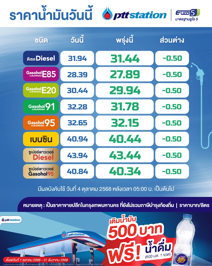 ปตท. ปรับลดราคาน้ำมันกลุ่มเบนซินและดีเซลทุกชนิด โดยน้ำมันในกลุ่มเบนซินและดีเซล ปรับลดราคา 0.50 บาท/ลิตร มีผลวันที่ 4 ตุลาคม 2568 ตั้งแต่เวลา 05.00 น. เป็นต้นไป