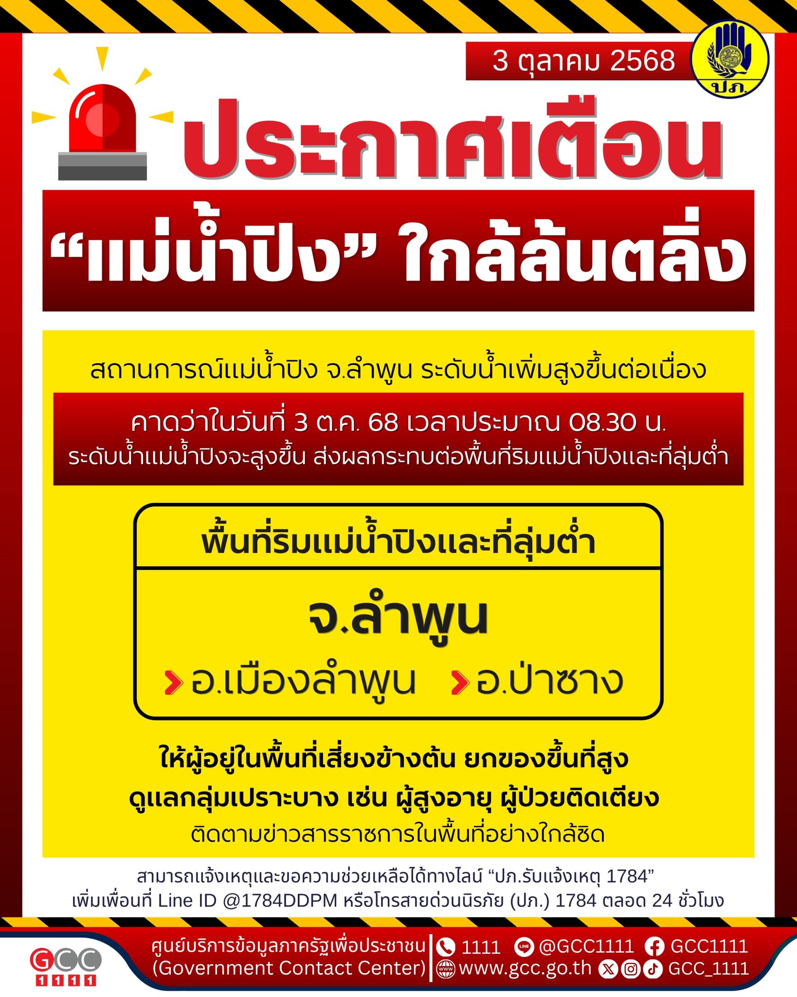 กรมป้องกันและบรรเทาสาธารณภัย (ปภ.) และจังหวัดลำพูน ได้ติดตามสถานการณ์น้ำแม่น้ำปิงในพื้นที่ จ.ลำพูน พบว่า ระดับน้ำแม่น้ำปิงเพิ่มสูงขึ้นต่อเนื่อง คาดว่าในวันที่3 ต.ค.68 เวลาประมาณ08.30น. ระดับน้ำแม่น้ำปิงจะสูงขึ้นและส่งผลกระทบต่อพื้นที่ริมแม่น้ำปิง และที่ลุ่มต่ำ ในเขตพื้นที่ อ.เมืองฯ อ.ป่าซาง และพื้นที่ใกล้เคียง ให้ผู้อยู่ในพื้นที่เสี่ยงข้างต้น ยกของขึ้นที่สูง ดูแลกลุ่มเปราะบาง เช่น ผู้สูงอายุ ผู้ป่วยติดเตียง และติดตามข่าวสารราชการในพื้นที่อย่างใกล้ชิด