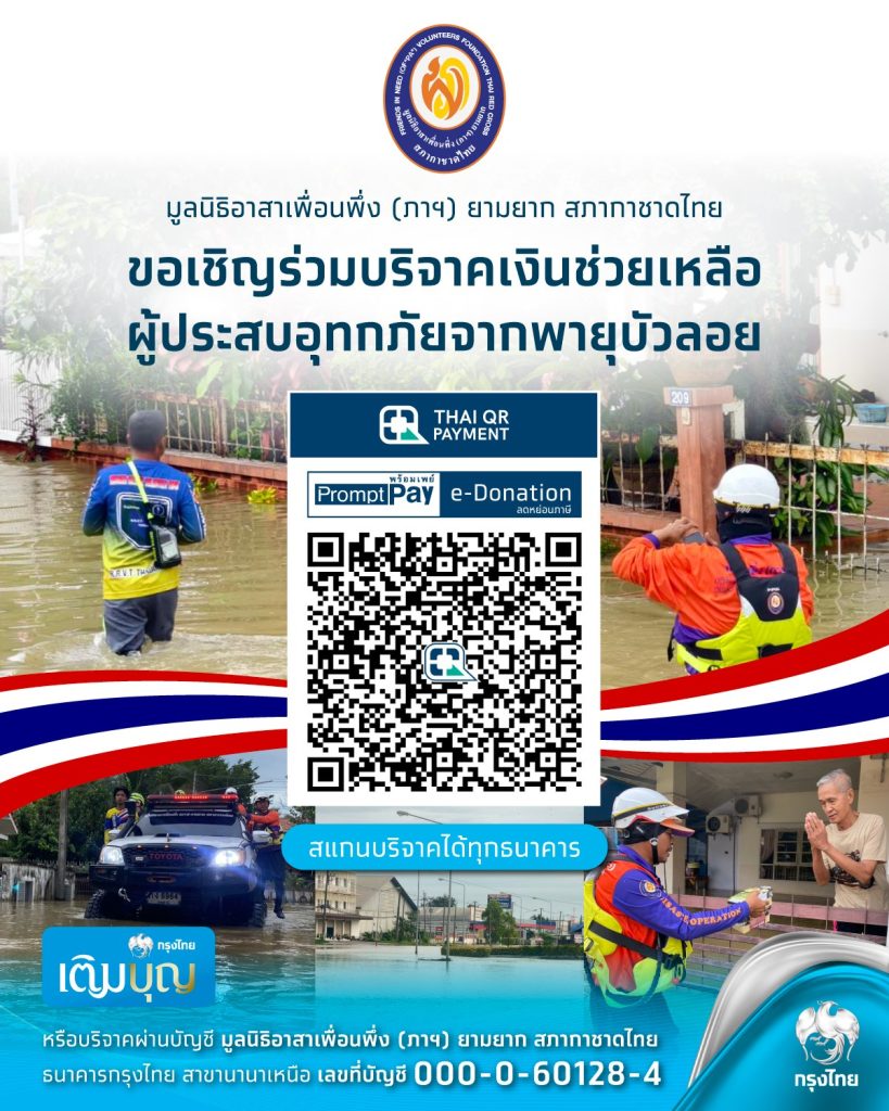 ธนาคารกรุงไทยขอเชิญร่วมส่งต่อความห่วงใย ช่วยเหลือผู้ประสบอุทกภัย เพื่อผ่านพ้นวิกฤตนี้ไปด้วยกัน ผ่านมูลนิธิอาสาเพื่อนพึ่ง (ภาฯ) ยามยาก สภากาชาดไทย ด้วยการสแกน QR Code E-Donation ผ่านแอปพลิเคชันของทุกธนาคาร (ข้อมูลการบริจาคจะส่งเข้าระบบลดหย่อนภาษีของกรมสรรพากรอัตโนมัติ และรับใบอนุโมทนาบัตรทางอีเมลทันที) หรือบริจาคผ่านบัญชีออมทรัพย์ มูลนิธิอาสาเพื่อนพึ่ง (ภาฯ) ยามยาก สภากาชาดไทย เลขที่ 000-0-60128-4 ธนาคารกรุงไทย สาขานานาเหนือ