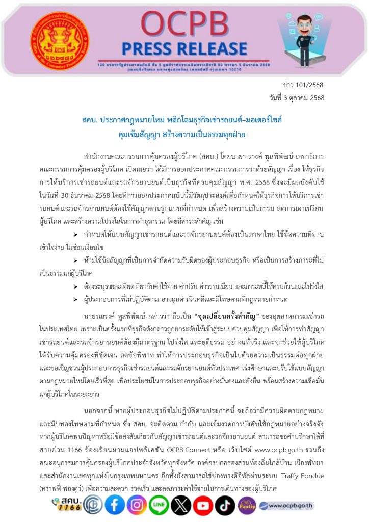 สำนักงานคณะกรรมการคุ้มครองผู้บริโภค (สคบ.) โดยนายรณรงค์ พูลพิพัฒน์ เลขาธิการคณะกรรมการคุ้มครองผู้บริโภค เปิดเผยว่า ได้มีการออกประกาศคณะกรรมการว่าด้วยสัญญา เรื่อง ให้ธุรกิจการให้บริการเช่ารถยนต์และรถจักรยานยนต์เป็นธุรกิจที่ควบคุมสัญญา พ.ศ. 2568 ซึ่งจะมีผลบังคับใช้ในวันที่ 30 ธันวาคม 2568 โดยที่การออกประกาศฉบับนี้มีวัตถุประสงค์เพื่อกำหนดให้ธุรกิจการให้บริการเช่ารถยนต์และรถจักรยานยนต์ต้องใช้สัญญาตามรูปแบบที่กำหนด เพื่อสร้างความเป็นธรรม ลดการเอาเปรียบผู้บริโภค และสร้างความโปร่งใสในการทำธุรกรรม โดยมีสาระสำคัญ เช่น