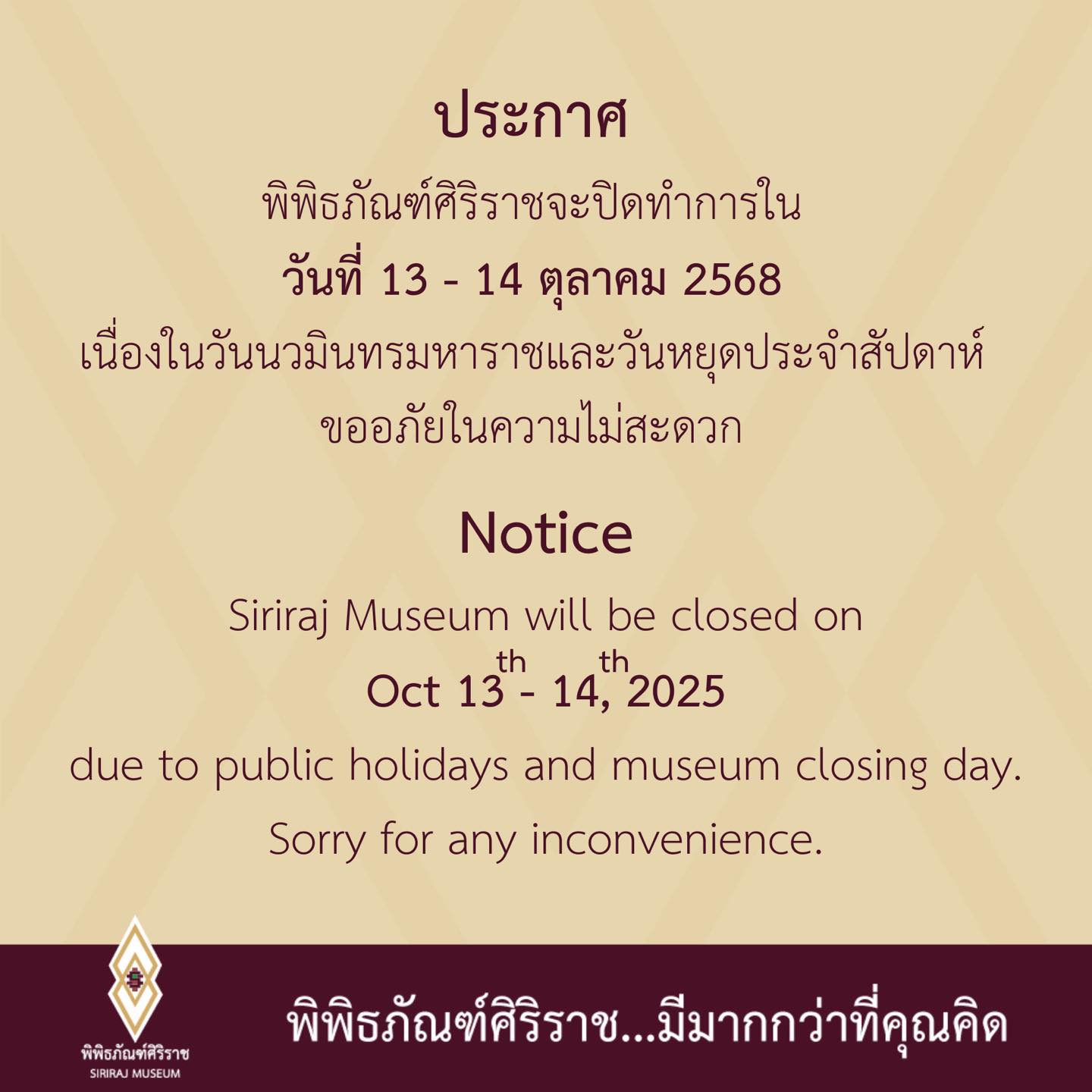 • พิพิธภัณฑ์ศิริราช แจ้งปิดทำการ ในวันที่ 13 – 14 ตุลาคม 2568