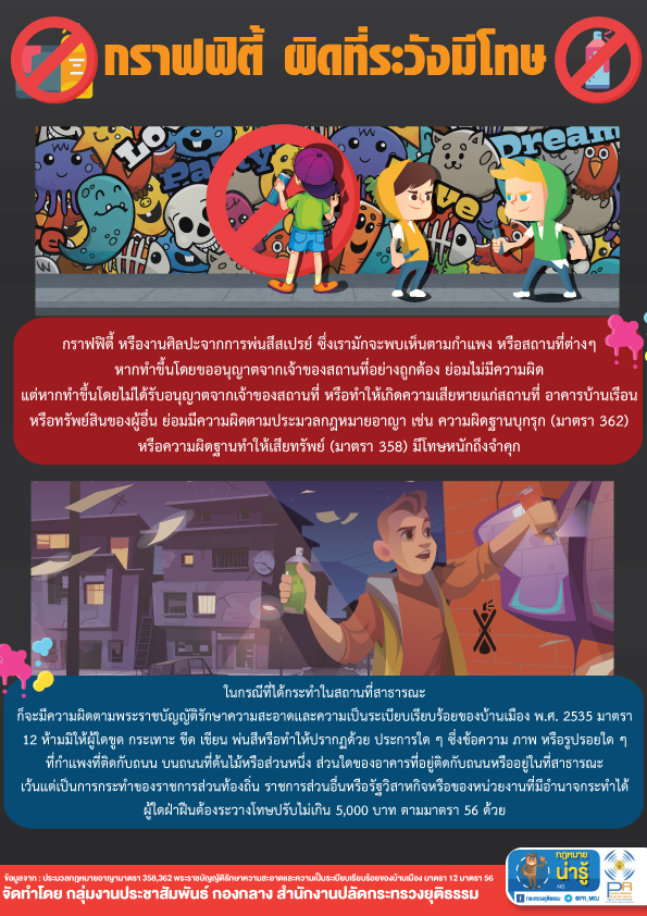 กระทรวงยุติธรรม แจ้งเตือน การพ่นสีหรือทำกราฟฟิตี้ในพื้นที่สาธารณะหรือทรัพย์สินผู้อื่นโดยไม่ได้รับอนุญาต ถือเป็นความผิดตามประมวลกฎหมายอาญา ฐานบุกรุกหรือทำให้เสียทรัพย์ และยังเข้าข่ายความผิดตามพระราชบัญญัติรักษาความสะอาดฯ พ.ศ. 2535 มีโทษปรับไม่เกิน 5,000 บาท หากเป็นการกระทำในสถานที่สาธารณะ