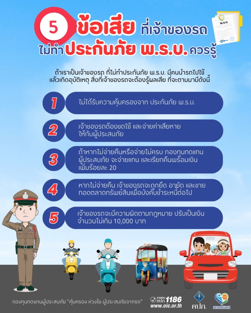 กองทุนทดแทนผู้ประสบภัย แจ้ง 5 ข้อเสีย ที่เจ้าของรถไม่จัดทำประกันภัย พ.ร.บ. ควรรู้ ดังนี้