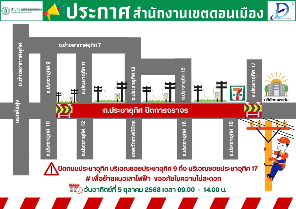 สำนักงานเขตดอนเมือง แจ้งปิดการจราจรชั่วคราว ถนนประชาอุทิศ บริเวณซอยประชาอุทิศ 9 – ซอยประชาอุทิศ 17 เพื่อดำเนินการย้ายแนวสายไฟฟ้า วันอาทิตย์ที่ 5 ตุลาคม 2568 ตั้งแต่เวลา 09.00 น. – 14.00 น. ขออภัยในความไม่สะดวกระหว่างการดำเนินการดังกล่าว และโปรดวางแผนการเดินทางล่วงหน้าเพื่อหลีกเลี่ยงผลกระทบ