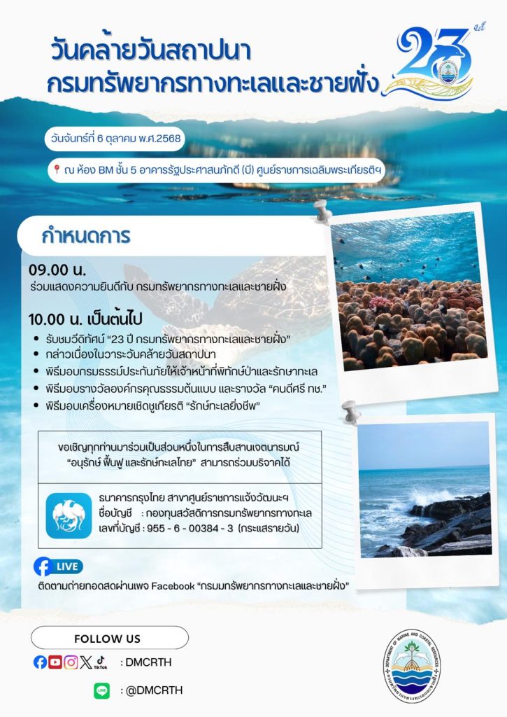 กรมทรัพยากรทางทะเลและชายฝั่ง เชิญร่วมแสดงความยินดีเนื่องในวันคล้ายวันสถาปนาครบรอบ 23 ปี กรมทรัพยากรทางทะเลและชายฝั่ง วันที่ 6 ตุลาคม 2568 ตั้งแต่เวลา 09.00 – 12.00 น. ณ บริเวณชั้น 5 กรมทรัพยากรทางทะเลและชายฝั่ง และติดตามถ่ายทอดสดผ่านเพจ Facebook “กรมมทรัพยากรทางทะเลและชายฝั่ง”