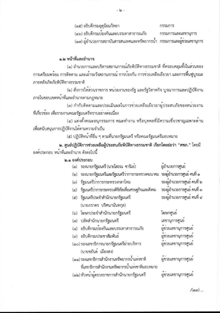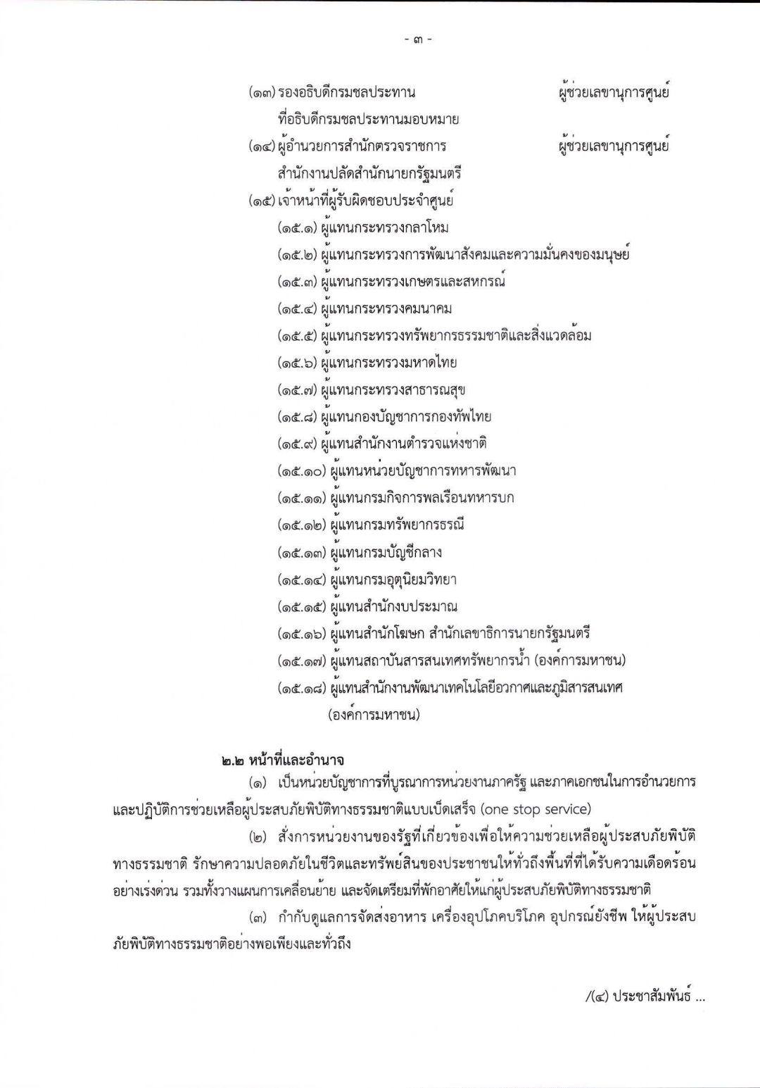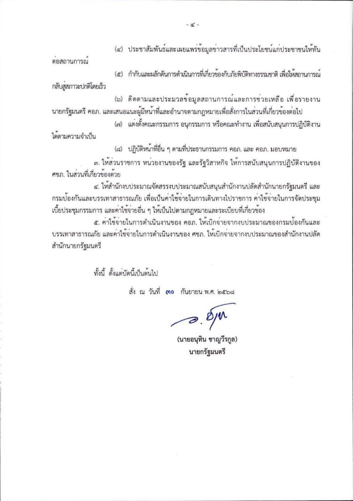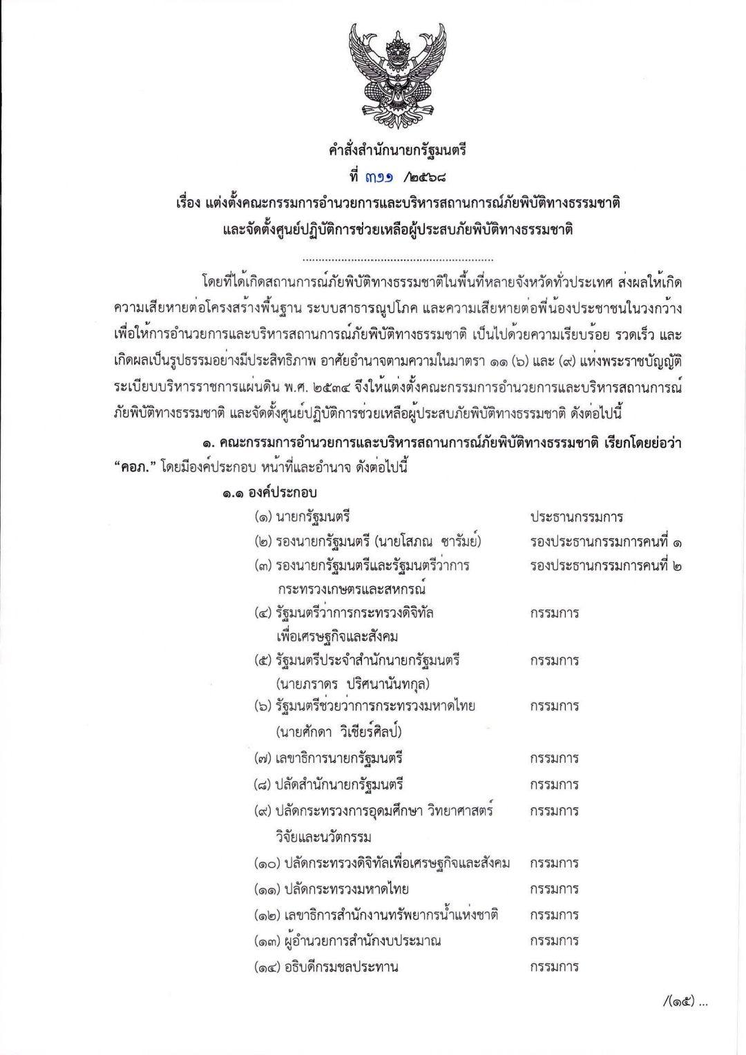 นายกรัฐมนตรี แต่งตั้งคณะกรรมการอำนวยการและบริหารสถานการณ์ภัยพิบัติทางธรรมชาติ และจัดตั้งศูนย์ปฏิบัติการช่วยเหลือผู้ประสบภัยพิบัติทางธรรมชาติ เพื่อให้การอำนวยการและบริหารสถานการณ์ภัยพิบัติทางธรรมชาติ เป็นไปด้วยความเรียบร้อย รวดเร็ว และ เกิดผลเป็นรูปธรรมอย่างมีประสิทธิภาพ ดังต่อไปนี้ มีผลตั้งแต่บัดนี้ เป็นต้นไป