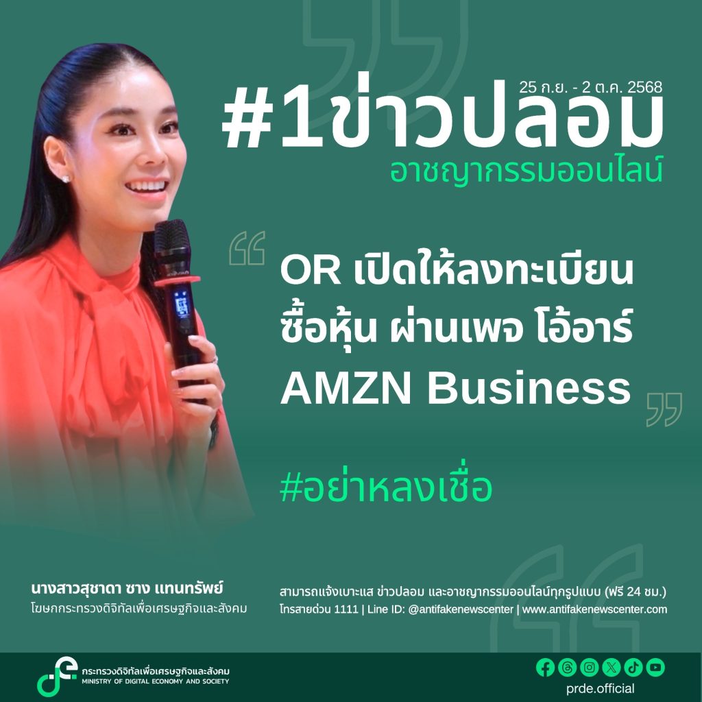 สำหรับอันดับ 1 เรื่อง “OR เปิดให้ลงทะเบียนซื้อหุ้น ผ่านเพจ โอ้อาร์ AMZN Business” กระทรวงดีอี ประสานงานร่วมกับ บริษัท ปตท. น้ำมันและการค้าปลีก จำกัด (มหาชน) หรือ OR กระทรวงพลังงาน พบว่าเป็นข้อมูลเท็จ โดยขอแจ้งเตือนว่าการประชาสัมพันธ์เปิดลงทะเบียนบัญชีซื้อหุ้น ผ่านเพจ โอ้อาร์ AMZN Business นั้นเป็นการกระทำของมิจฉาชีพ เนื่องจาก OR ไม่มีส่วนเกี่ยวข้องกับเพจดังกล่าวแต่อย่างใด และไม่มีการเปิดลงทะเบียนในลักษณะดังกล่าว เพจนี้จงใจแอบอ้างใช้ชื่อและโลโก้ของ OR เพื่อสร้างความเข้าใจผิดแก่ประชาชน จึงขอให้ประชาชนอย่าหลงเชื่อและตรวจสอบข้อมูลให้รอบคอบทุกครั้งก่อนลงทุน