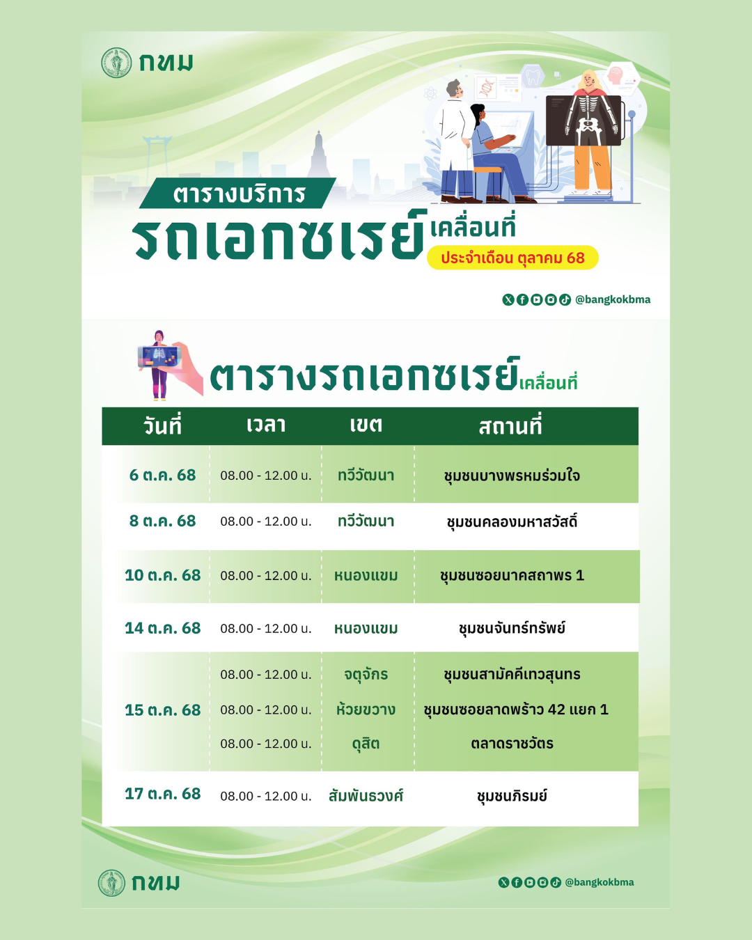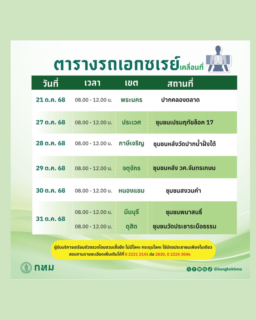กรุงเทพมหานคร บริการออกตรวจ รถเอกซเรย์เคลื่อนที่ ประจำเดือนตุลาคม 2568 ระหว่างวันที่ 6 – 31 ตุลาคม 2568 สถานที่ ดังนี้