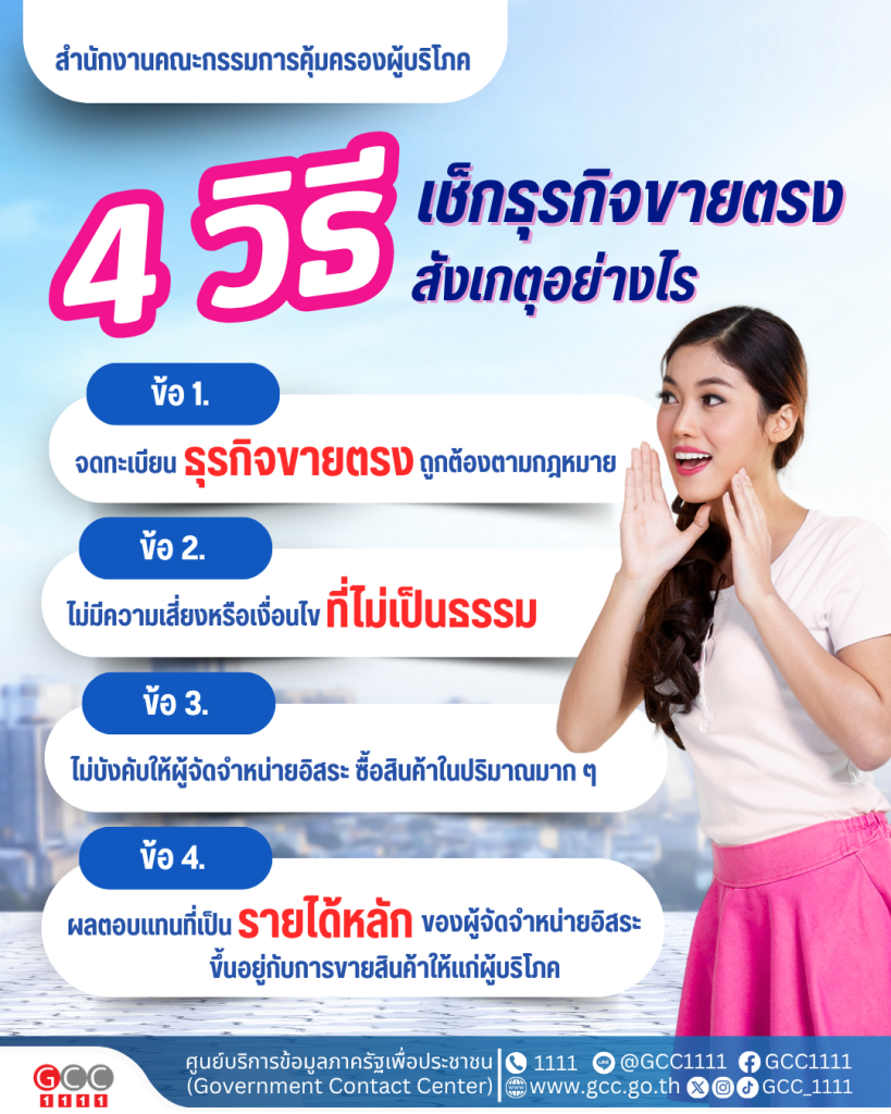 สำนักงานคณะกรรมการคุ้มครองผู้บริโภค แนะนำ 4 วิธี เช็กธุรกิจขายตรง สังเกตุอย่างไร ข่าวสารกิจกรรม สำนักงานคณะกรรมการคุ้มครองผู้บริโภค แนะนำ 4 วิธี เช็กธุรกิจขายตรง สังเกตุอย่างไร สำนักงานคณะกรรมการคุ้มครองผู้บริโภค แนะนำ 4 วิธี เช็กธุรกิจขายตรง สังเกตุอย่างไร1. จดทะเบียนธุรกิจขายตรง ถูกต้องตามกฎหมาย2. ไม่มีความเสี่ยงหรือเงื่อนไขที่ไม่เป็นธรรมต่อผู้บริโภคและผู้จัดจำหน่ายอิสระ3. ไม่บังคับหรือชักจูง ให้ผู้จัดจำหน่ายอิสระ ซื้อสินค้าในปริมาณมาก ๆ4. ผลตอบแทนที่เป็นรายได้หลักของผู้จัดจำหน่ายอิสระขึ้นอยู่กับการขายสินค้าให้แก่ผู้บริโภค ที่มา : Facebook สำนักงานคณะกรรมการคุ้มครองผู้บริโภค Post Views: 12 FacebookFacebookXTwitterLINELine