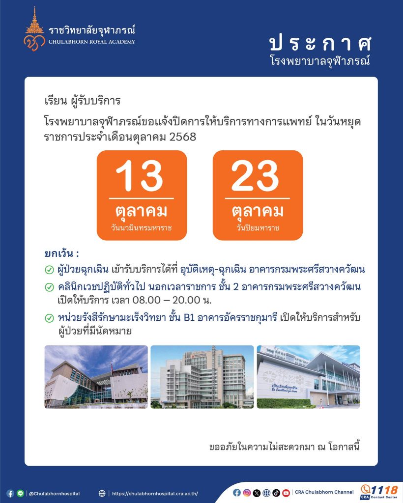 โรงพยาบาลจุฬาภรณ์ ราชวิทยาลัยจุฬาภรณ์ แจ้งปิดการให้บริการทางการแพทย์ ประจำเดือนตุลาคม 2568