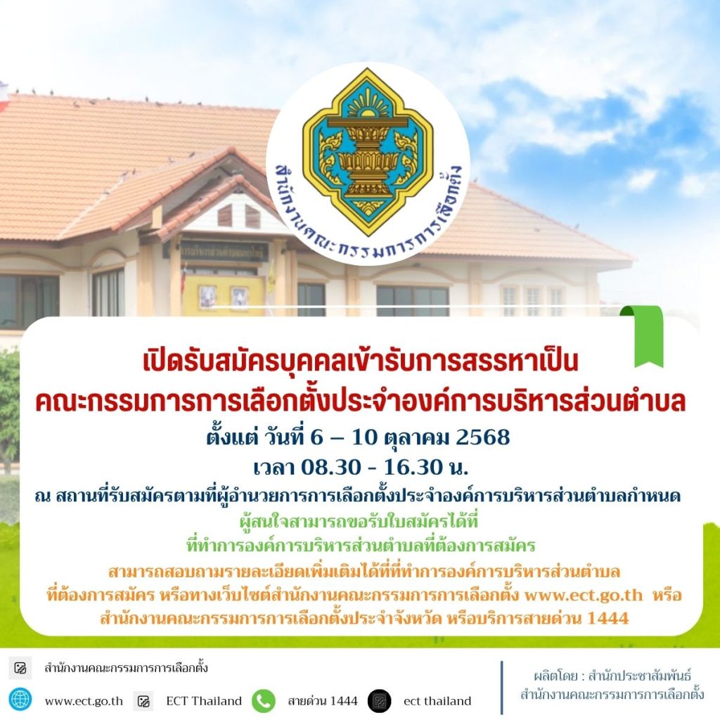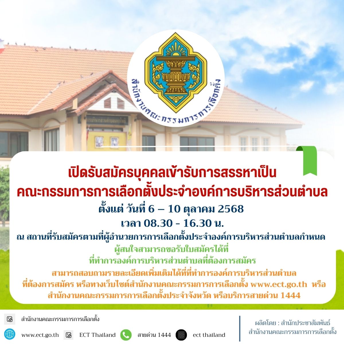 ด้วยสมาชิกสภาองค์การบริหารส่วนตำบลและนายกองค์การบริหารส่วนตำบลจะครบวาระการดำรงตำแหน่งในวันที่ 27 พฤศจิกายน 2568 ตามข้อ 31 และข้อ 34 ของระเบียบคณะกรรมการการเลือกตั้งว่าด้วยการเลือกตั้งสมาชิกสภาท้องถิ่นหรือผู้บริหารท้องถิ่น พ.ศ. 2562 และที่แก้ไขเพิ่มเติม กำหนดให้เมื่อมีกรณีที่ต้องมีการเลือกตั้งสมาชิกสภาท้องถิ่นหรือผู้บริหารท้องถิ่นขององค์กรปกครองส่วนท้องถิ่น ให้คณะกรรมการการเลือกตั้งแต่งตั้งคณะกรรมการการเลือกตั้งประจำองค์กรปกครองส่วนท้องถิ่น โดยให้ผู้อำนวยการการเลือกตั้งประจำองค์กรปกครองส่วนท้องถิ่นดำเนินการรับสมัครบุคคลผู้มีคุณสมบัติ และไม่มีลักษณะต้องห้าม เข้ารับการสรรหาเป็นคณะกรรมการการเลือกตั้งประจำองค์กรปกครองส่วนท้องถิ่น โดยให้มีระยะเวลาการรับสมัครไม่น้อยกว่า 5 วัน และให้ผู้สมัครยื่นใบสมัครด้วยตนเองต่อผู้อำนวยการการเลือกตั้งประจำองค์กรปกครองส่วนท้องถิ่น